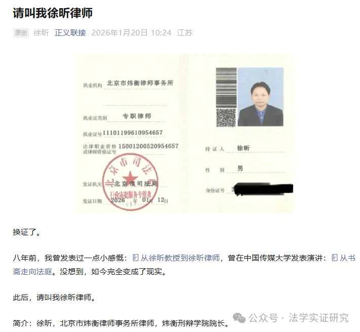 OCR:IMG:请叫我徐昕律师 原创徐昕正义联接2026年1月20日10:24江苏 执业机构北京市炜衡律师事务所 执业证类别 专职律师 执业证号11101199610954657 法律职业资格15001200520954657 持证人徐昕 成律师资格证号 市司 福 男 发证机关 兰北京市司法局 行政电批服务专用意 身份证号 发证日期 2026 12日 换证了。 八年前,我曾发表过一点小感慨:目从徐昕教授到徐昕律师,曾在中国传媒大学发表演讲:目从书 斋走向法庭。没想到,如今完全变成了现实。 此后,请叫我徐昕律师。 公众号·法学实证研究 简介:徐昕,北京市炜衡律师事务所律师,炜衡刑辩学院院长