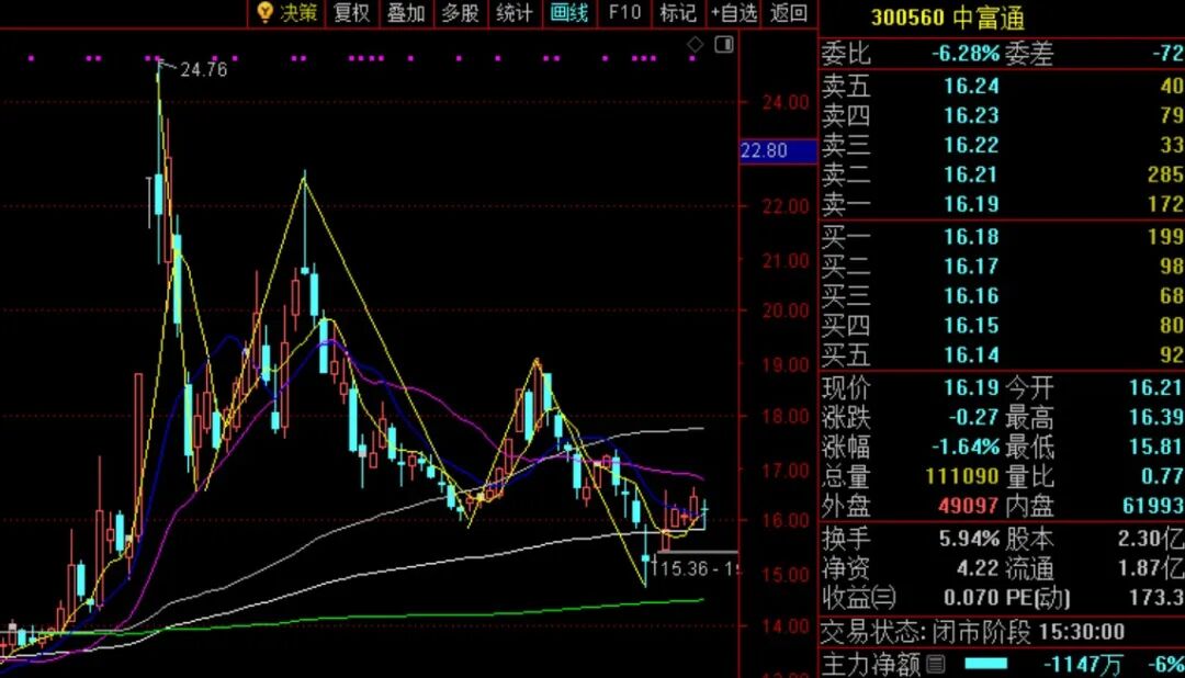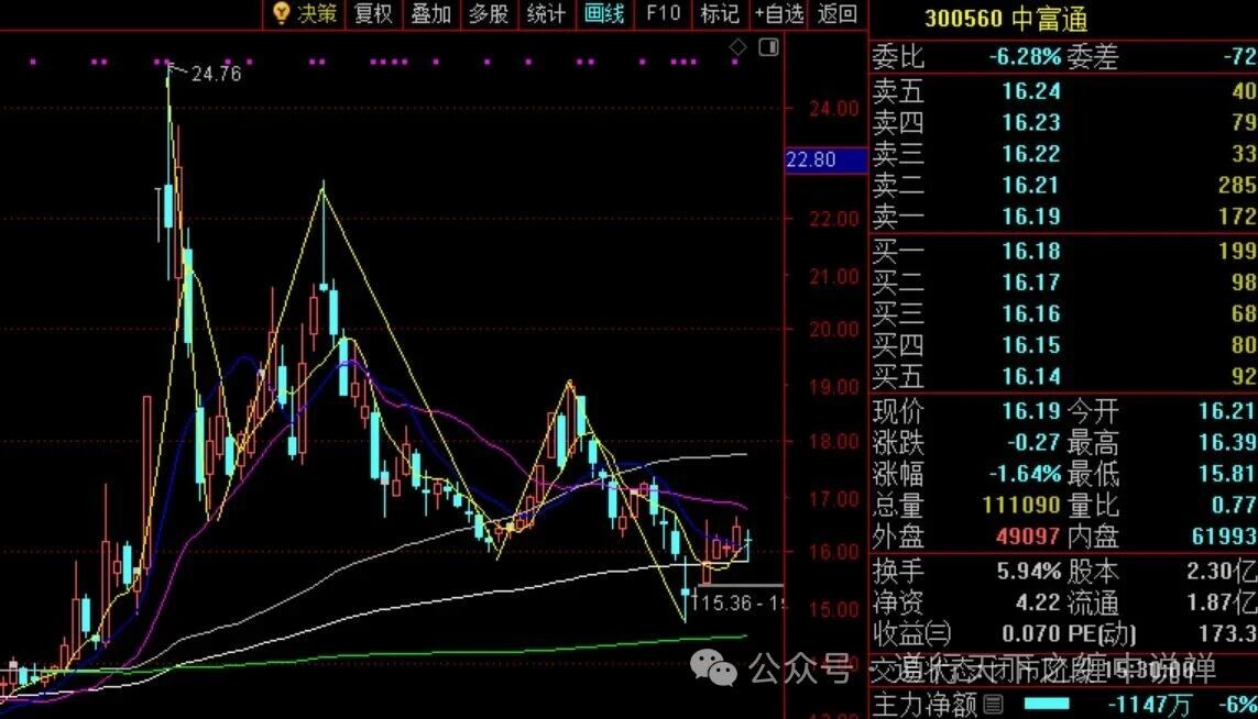 OCR:IMG:决策复权叠加多股 统计 田线 F10标记+自选返回 300560中富通 委比 -6.28%委差 -72 卖五 16.24 079 24.00 卖四 16.23 卖卖卖 大 33 22.80 三 16.22 16.21 285 22.00 16.19 172 买买买 16.18 199 21.00 16.17 98 16.16 68 20.00 买四 16.15 80 买五 16.14 92 19.00 现价 16.19今开 16.21 涨跌 -0.27最高 18.00 16.39 涨幅 -1.64%最低 15.81 17.00 总量 111090量比 0.77 外盘 49097内盘 61993 16.00 换手 5.94%股本 2.30亿 15.36-1 净资 4.22流通 1.87亿 15.00 收益 0.070PE(动] 173.3 公众号 交道状态天闭市院鲤中晚禅 主力净额 -1147万 -6%