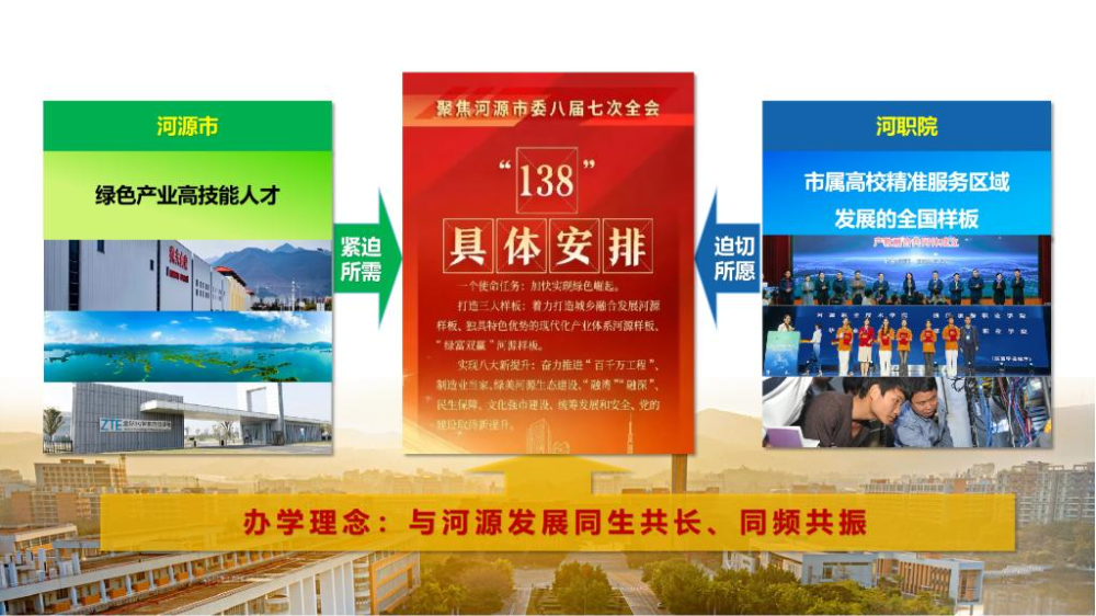 OCR:IMG:聚焦河源市委八届七次全会河源市河职院138市属高校精准服务区域绿色产业高技能人才发展的全国样板具体安排紧迫迫切所需所愿一个使命任务:加快实现绿色崛起。打造三人样板:着力打造城乡融合发展河源样板、独具特色优势的现代化产业体系河源样板、“绿富双赢”河游样板。实现八大新提升:奋力推进“百千万工程”制造业当家、绿美河源生态建设、“融融深”民生保障、文化强市建设、统筹发展和安全、党的建设取得新提升办学理念:与河源发展同生共长、同频共振