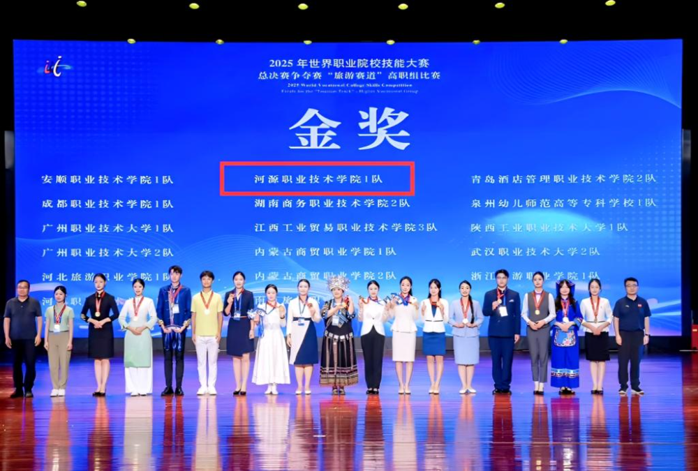 OCR:IMG:2025年世界职业院校技能大赛总决赛争夺赛“旅游赛道”高职组比赛金奖安顺职业技术学院1队河源职业技术学院队青岛酒店管理职业技术学院2队成都职业技术学院1队湖南商务职业技术学院2队泉州幼儿师范高等专科学校!队广州职业技术大学1队江西工业贸易职业技术学院3队陕西工业职业技术大学1队广州职业技术大学2队内蒙古商贸职业学院1队武汉职业技术大学2队河北旅游业学内蒙古院2队浙江游元