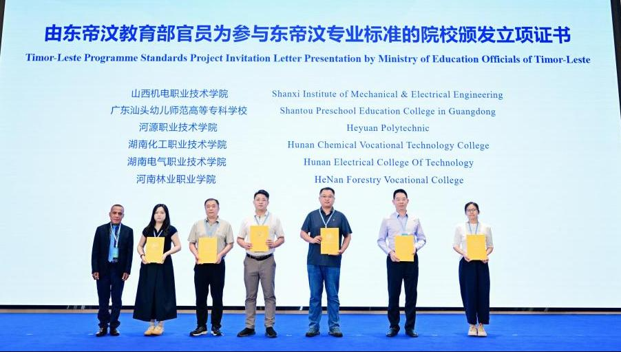 OCR:IMG:由东帝汶教育部官员为参与东帝汶专业标准的院校颁发立项证书Timor-Leste Programme Standards Project Invitation Letter Presentation by Ministry ofEducation Officials of Timor-Leste 山西机电职业技术学院Shanxi Instituteof Mechanical&Electrical Engineering 广东汕头幼儿师范高等专科学校Shantou Preschool Education Collegein Guangdong 河源职业技术学院Heyuan Polytechnic 湖南化工职业技术学院Hunan ChemicalVocational Technology College 湖南电气职业技术学院HunanElectrical CollegeOf Technology 河南林业职业学院HeNan ForestryVocational College