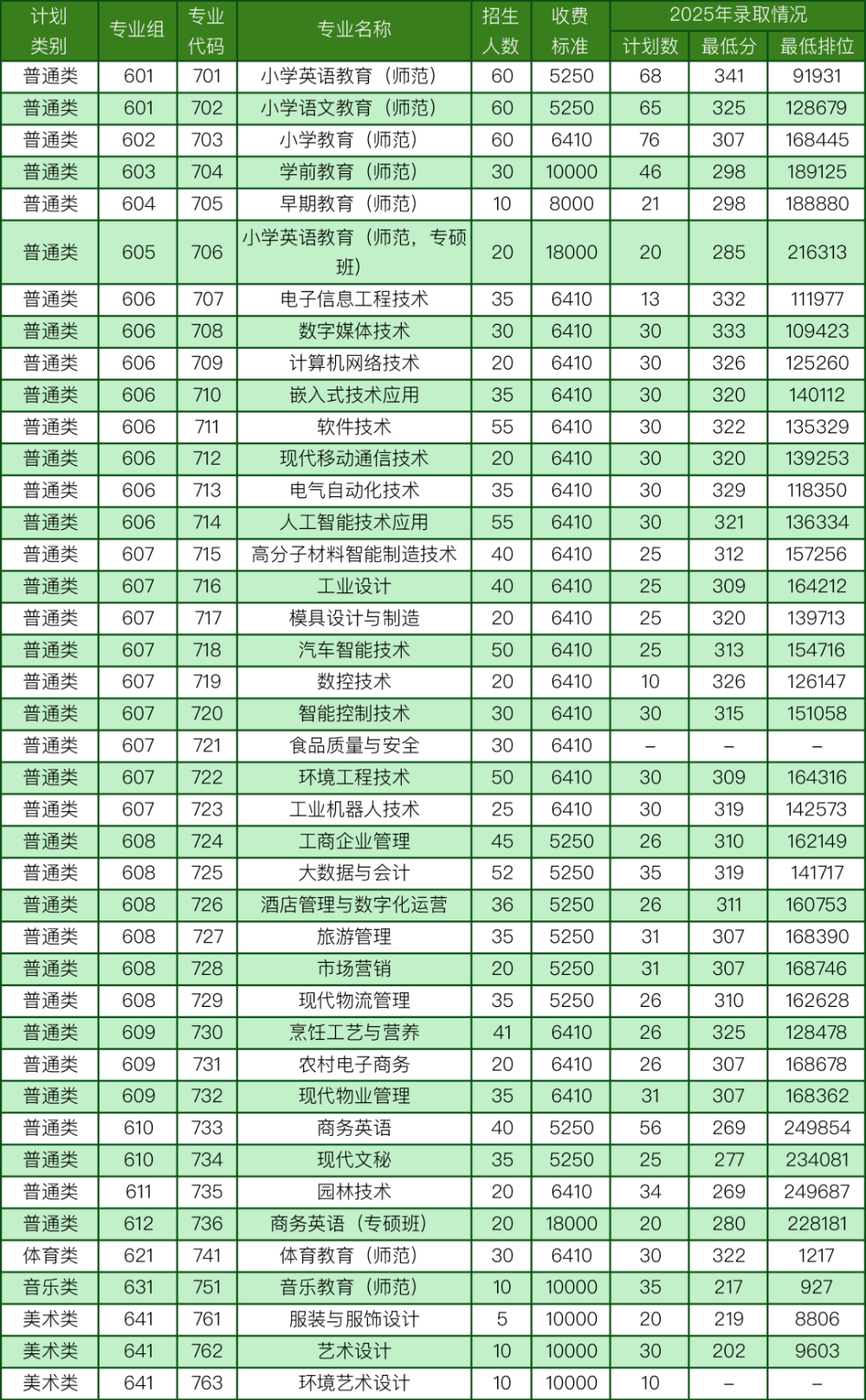 OCR:IMG:计划专业招生收费2025年录取情况专业组专业名称类别代码人数标准计划数最低分最低排位普通类601701小学英语教育(师范)6052506834191931普通类601702小学语文教育(师范)60525065325128679普通类602703小学教育(师范)60641076307168445普通类603704学前教育(师范)301000046298189125普通类604705早期教育(师范)10800021298188880小学英语教育(师范,专硕普通类605706201800020285216313班)普通类606707电子信息工程技术35641013332111977普通类606708数字媒体技术30641030333109423普通类606709计算机网络技术20641030326125260普通类606710嵌入式技术应用35641030320140112普通类606711软件技术55641030322135329普通类606712现代移动通信技术20641030320139253普通类606713电气自动化技术35641030329118350普通类606714人工智能技术应用55641030321136334普通类607715高分子材料智能制造技术40641025312157256普通类607716工业设计40641025309164212普通类607717模具设计与制造20641025320139713普通类607718汽车智能技术50641025313154716普通类607719数控技术20641010326126147普通类607720智能控制技术30641030315151058普通类607721食品质量与安全306410-普通类607722环境工程技术50641030309164316普通类607723工业机器人技术25641030319142573普通类608724工商企业管理45525026310162149普通类608725大数据与会计52525035319141717普通类608726酒店管理与数字化运营36525026311160753普通类608727旅游管理35525031307168390普通类608728市场营销20525031307168746普通类608729现代物流管理35525026310162628普通类609730烹饪工艺与营养41641026325128478普通类609731农村电子商务20641026307168678普通类609732现代物业管理35641031307168362普通类610733商务英语40525056269249854普通类610734现代文秘35525025277234081普通类611735园林技术20641034269249687普通类612736商务英语(专硕班)201800020280228181体育类621741体育教育(师范)306410303221217音乐类631751音乐教育(师范)101000035217927美术类641761服装与服饰设计510000202198806美术类641762艺术设计1010000302029603美术类641763环境艺术设计101000010-