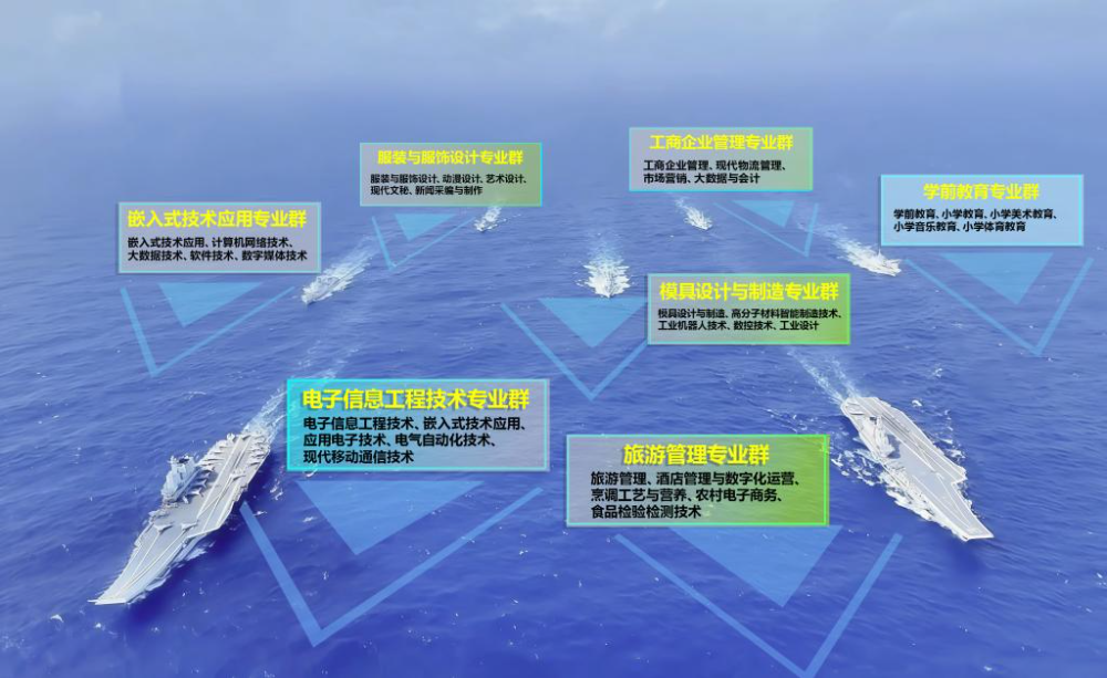 OCR:IMG:工商企业管理专业群服装与服饰设计专业群工商企业管理、现代物流管理、服装与服饰设计、动漫设计、艺术设计、市场营销、大数据与会计现代文秘、新闻采编与制作学前教育专业群嵌入式技术应用专业群学前教育、小学教育、小学美术教育、小学音乐教育、小学体育教育嵌入式技术应用、计算机网络技术、大数据技术、软件技术、数字媒体技术模具设计与制造专业群模具设计与制造、高分子材料智能制造技术。工业机器人技术、数控技术、工业设计电子信息工程技术专业群电子信息工程技术、嵌入式技术应用、应用电子技术、电气自动化技术、现代移动通信技术旅游管理专业群旅游管理、酒店管理与数字化运营、烹调工艺与营养、农村电子商务、食品检验检测技术