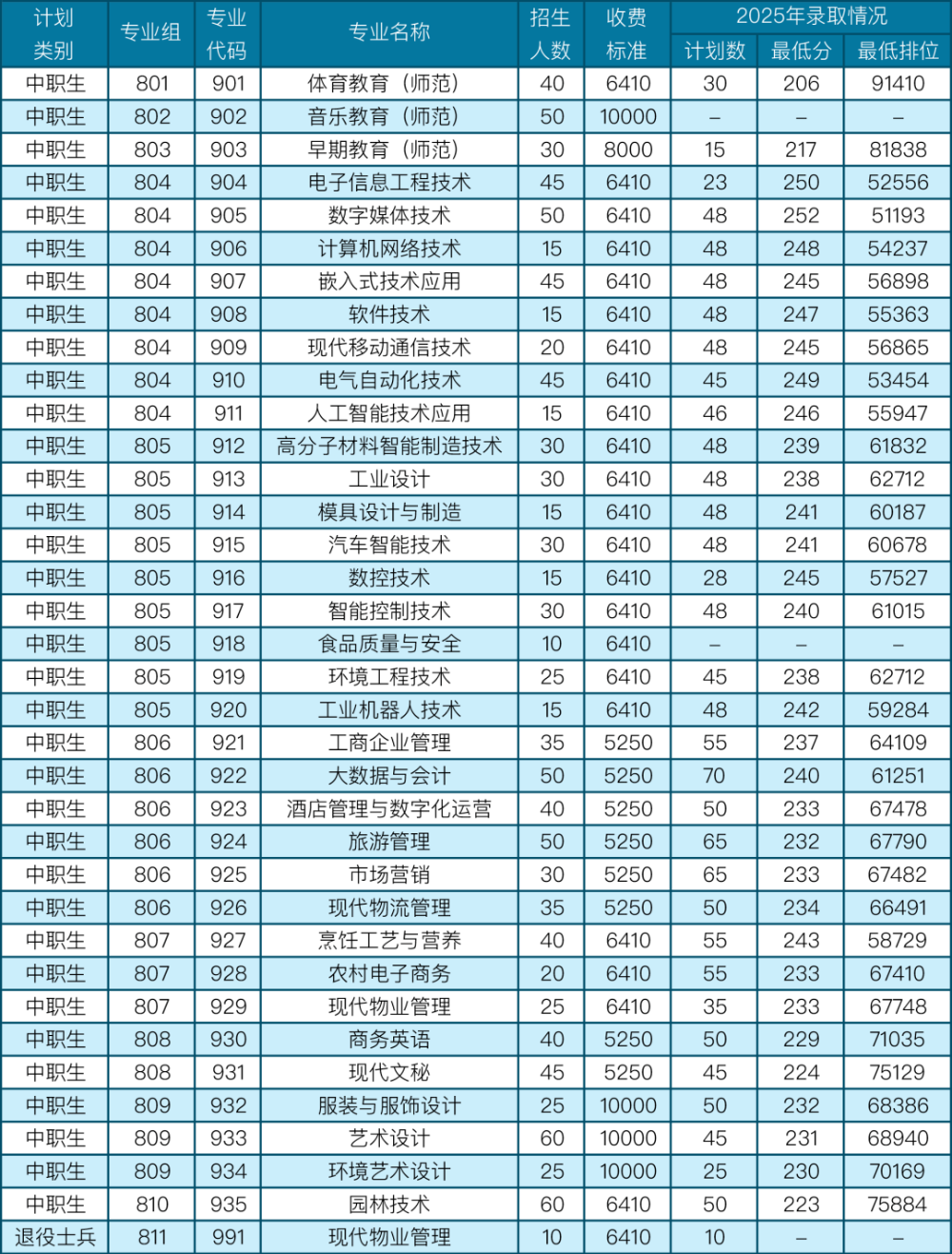 OCR:IMG:计划专业招生收费2025年录取情况专业组专业名称类别代码人数标准计划数最低分最低排位中职生801901体育教育(师范)4064103020691410中职生802902音乐教育(师范)5010000--中职生803903早期教育(师范)3080001521781838中职生804904电子信息工程技术4564102325052556中职生804905数字媒体技术5064104825251193中职生804906计算机网络技术1564104824854237中职生804907嵌入式技术应用4564104824556898中职生804908软件技术1564104824755363中职生804606现代移动通信技术2064104824556865中职生804910电气自动化技术4564104524953454中职生804911人工智能技术应用1564104624655947中职生805912高分子材料智能制造技术3064104823961832中职生805913工业设计3064104823862712中职生805914模具设计与制造1564104824160187中职生805915汽车智能技术3064104824160678中职生805916数控技术1564102824557527中职生805917智能控制技术3064104824061015中职生805918食品质量与安全106410---中职生805919环境工程技术2564104523862712中职生805920工业机器人技术1564104824259284中职生806921工商企业管理3552505523764109中职生806922大数据与会计5052507024061251中职生806923酒店管理与数字化运营4052505023367478中职生806924旅游管理5052506523267790中职生806925市场营销3052506523367482中职生806926现代物流管理3552505023466491中职生807927烹饪工艺与营养4064105524358729中职生807928农村电子商务2064105523367410中职生807929现代物业管理2564103523367748中职生808930商务英语4052505022971035中职生808931现代文秘4552504522475129中职生809932服装与服饰设计25100005023268386中职生809933艺术设计60100004523168940中职生809934环境艺术设计25100002523070169中职生810935园林技术6064105022375884退役士兵811991现代物业管理10641010-
