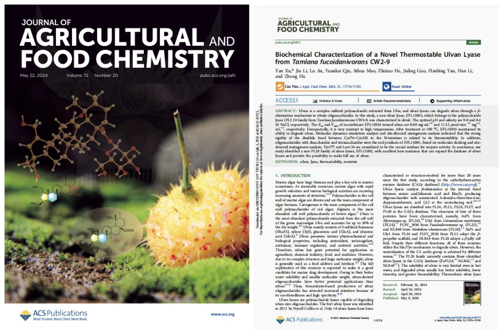 OCR:IMG:JOURNALOF AGRICULTURALAND AGRICULTURAL FOOD CHEMISTRY AND pubs.acs.org/1AFC Arsd FOODCHEMISTRY Biochemical Characterization of a Novel Thermostable Ulvan Lyase fromTamlanafucoidanivoransCW2-9Volume72Yg May22.224Number20pubs.acs.org/jafc and ZhongHu Rd CkeThicAgFodChm20247211773-11781ACCESSI aMarcs Mom ArsdeRecommndrtions Supponhg ifomtion AlSRACT:nompeitelpochideetracedfmmnrungalentough eliniutionmechunimtooltainol,chndynPLchotchd lyase(Pl.)28familyfaomTamla donierawCW2-9,wa acteriedindetal.TheoptmalpHandslinityae9.0and0.4MNaCLrespoctively.TheK,and V ..of recombinant EPL.15o85towand uhan are Os0mgml.ripdity of the dulfde bond Cys74-Cysl02in the N-termimus is related to its indicatedthatthes ostblity.In addzion,lyusesand provilehepobleyto makefull eaf KEYWORDS:ahu,hw 1.INTRODUCTION cabohydnte-ative ian 20years Mainealgaehuwlarge algebion (A)at coPL4P128P17namely,AsPL.(PL.25),COOH AsPLand add(ldeA).PL.25adoptthep apgdlyroll inthe CAZydimbuse(FaP12&,NLR42NLR483Thesolabilityofuhean svaylimited cren in hot candidatefor caived:beay 254Apwi262024Ulun lyasesare co-fimdlinessandlegh hundelyaescapableofdogradin May9,24nlun intooligosacchundes.Thefintulvan lyasewa idereifed ACSPublications www.acs.org in201l byNyvall Collnetal Only16uhun lyaeshavebeen MostTrusted.MostCtedMostRead ACS Publications 112773