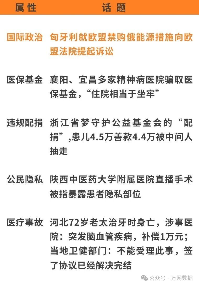 OCR:IMG:属性 话题 国际政治 包牙利就欧盟禁购俄能源措施向欧 盟法院提起诉讼 医保基金襄阳、宜昌多家精神病医院骗取医 保基金,“住院相当于坐牢” 违规配捐浙江省梦守护公益基金会的“配 捐”,患儿4.5万善款4.4万被中间人 抽走 公民隐私陕西中医药大学附属医院直播手术 被指暴露患者隐私部位 医疗事故河北72岁老太治牙时身亡,涉事医 院:突发脑血管疾病,补偿1万元; 当地卫健部门:不能受理此事,签 了协议已经解决完结 公众号·万网数据