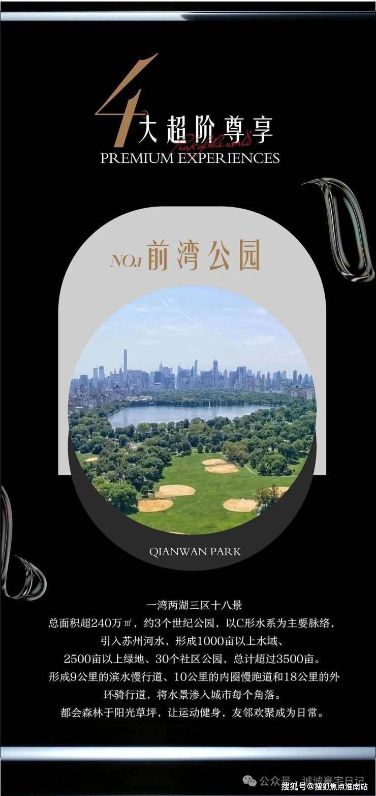 OCR:IMG:大超阶尊享 PREMIUMEXPERIENCES NO.前湾公园 QIANWANPARK 一湾两湖三区十八景 总面积超240万㎡,约3个世纪公园,以C形水系为主要脉络, 引入苏州河水,形成1000亩以上水域、 2500亩以上绿地、30个社区公园,总计超过3500亩。 形成9公里的滨水慢行道、10公里的内圈慢跑道和18公里的外 环骑行道,将水景渗入城市每个角落。 都会森林于阳光草坪,让运动健身,友邻欢聚成为日常。 搜狐号@搜狐焦点淮南站