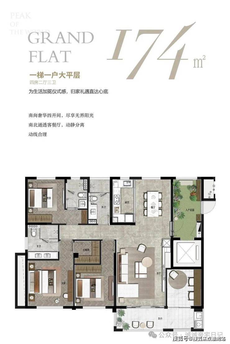 OCR:IMG:174 GRAND FLAT m 一梯一户大平层 四房二厅三卫 为生活加宽仪式感,归家礼遇直达心底 南向奢华四开间,尽享无界阳光 南北通透客餐厅,动静分离 动线合理 公众 诚诚豪宅日记 搜狐号@搜亚焦点淮南站