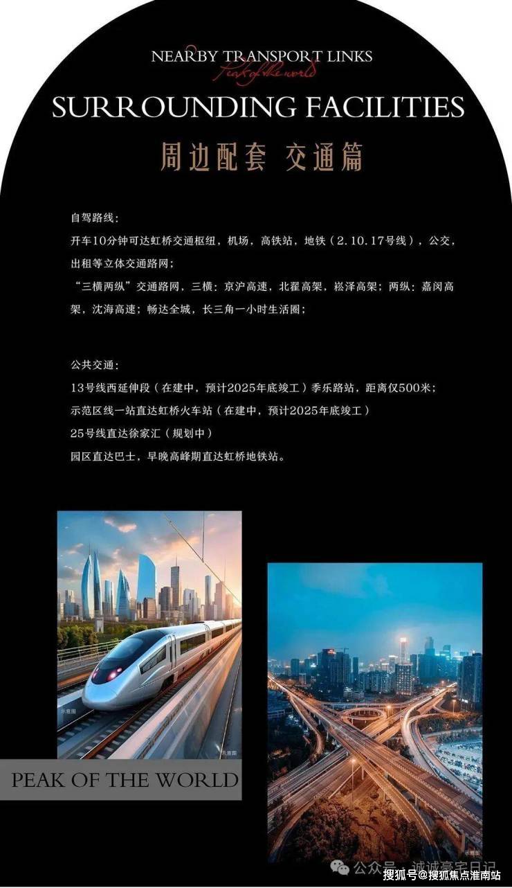 OCR:IMG:NEARBYTRANSPORTLINKS PeRo Lkenorl SURROUNDINGFACILITIES 周边配套 交通篇 自驾路线: 开车10分钟可达虹桥交通枢纽,机场,高铁站,地铁(2.10.17号线),公交, 出租等立体交通路网: “三横两纵”交通路网,三横:京沪高速,北翟高架,崧泽高架:两纵:嘉闵高 架,沈海高速;畅达全城,长三角一小时生活圈: 公共交通: 13号线西延伸段(在建中,预计2025年底峻工)季乐路站,距离仅500米; 示范区线一站直达虹桥火车站(在建中,预计2025年底竣工) 25号线直达徐家汇(规划中) 园区直达巴士,早晚高峰期直达虹桥地铁站。 PEAKOFTHEWORLD 诚诚豪宝且记