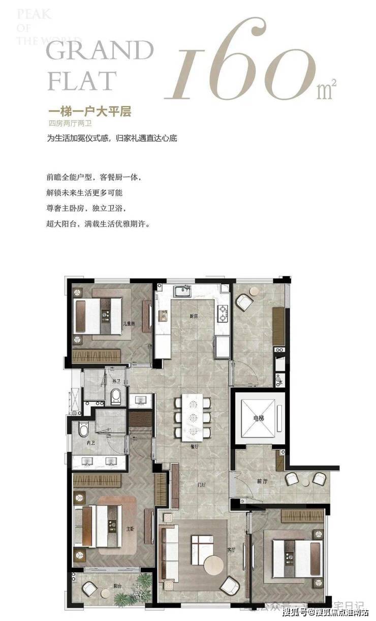OCR:IMG:PEAK GRAND 16o FLAT 一梯一户大平层 四房两厅两卫 为生活加冕仪式感,归家礼遇直达心底 前瞻全能户型,客餐厨一体, 解锁未来生活更多可能 尊奢主卧房,独立卫浴, 超大阳台,满载生活优雅期许。 金 事 福 0 天 搜狐号@搜亚焦点淮南站 宅日记