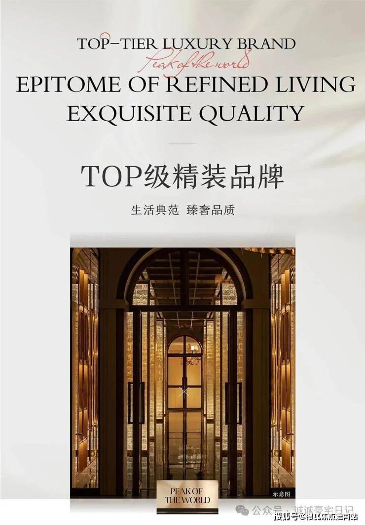 OCR:IMG:TOP-TIERLUXURYBRAND EPITOMEOFREFINEDLIVING EXQUISITE QUALITY TOP级精装品牌 生活典范臻奢品质 PEAKOF THEWORLD 示意图 搜狐号@搜亚焦点淮南站