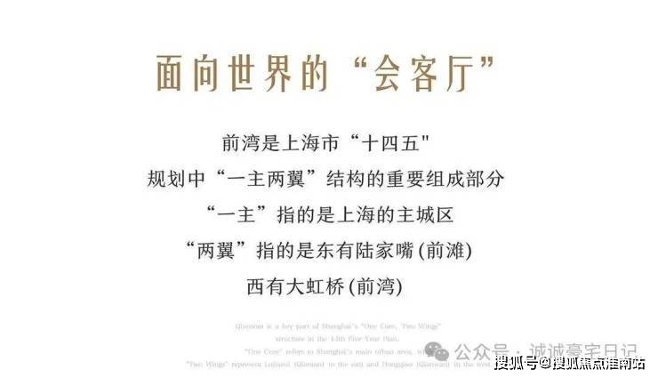OCR:IMG:面向世界的“会客厅 前湾是上海市“十四五” 规划中“一主两翼”结构的重要组成部分 “一主”指的是上海的主城区 “两翼”指的是东有陆家嘴(前滩) 西有大虹桥(前湾) 诚诚豪宅日记 搜狐号@澳狐焦点淮南站