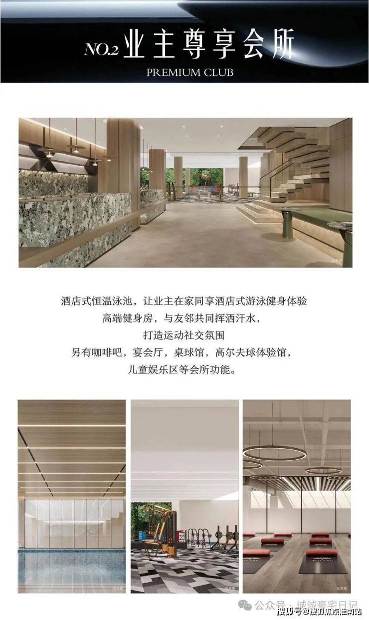 OCR:IMG:业主尊享会所 NO.2 PREMIUMCLUB 酒店式恒温泳池,让业主在家同享酒店式游泳健身体验 高端健身房,与友邻共同挥洒汗水 打造运动社交氛围 另有咖啡吧,宴会厅,桌球馆,高尔夫球体验馆, 儿童娱乐区等会所功能。 搜狐号@澳亚点点淮南站