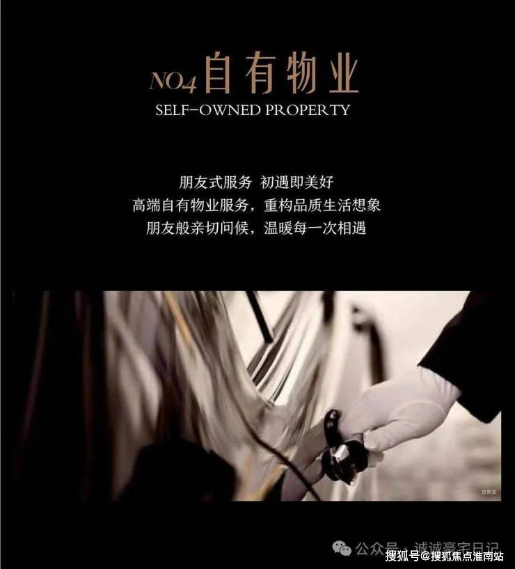 OCR:IMG:自有物业 NO4 SELF-OWNEDPROPERTY 朋发式服务初遇即美好 高端自有物业服务,重构品质生活想象 朋友般亲切问候,温暖每一次相遇 搜狐号@搜狐焦点淮南站