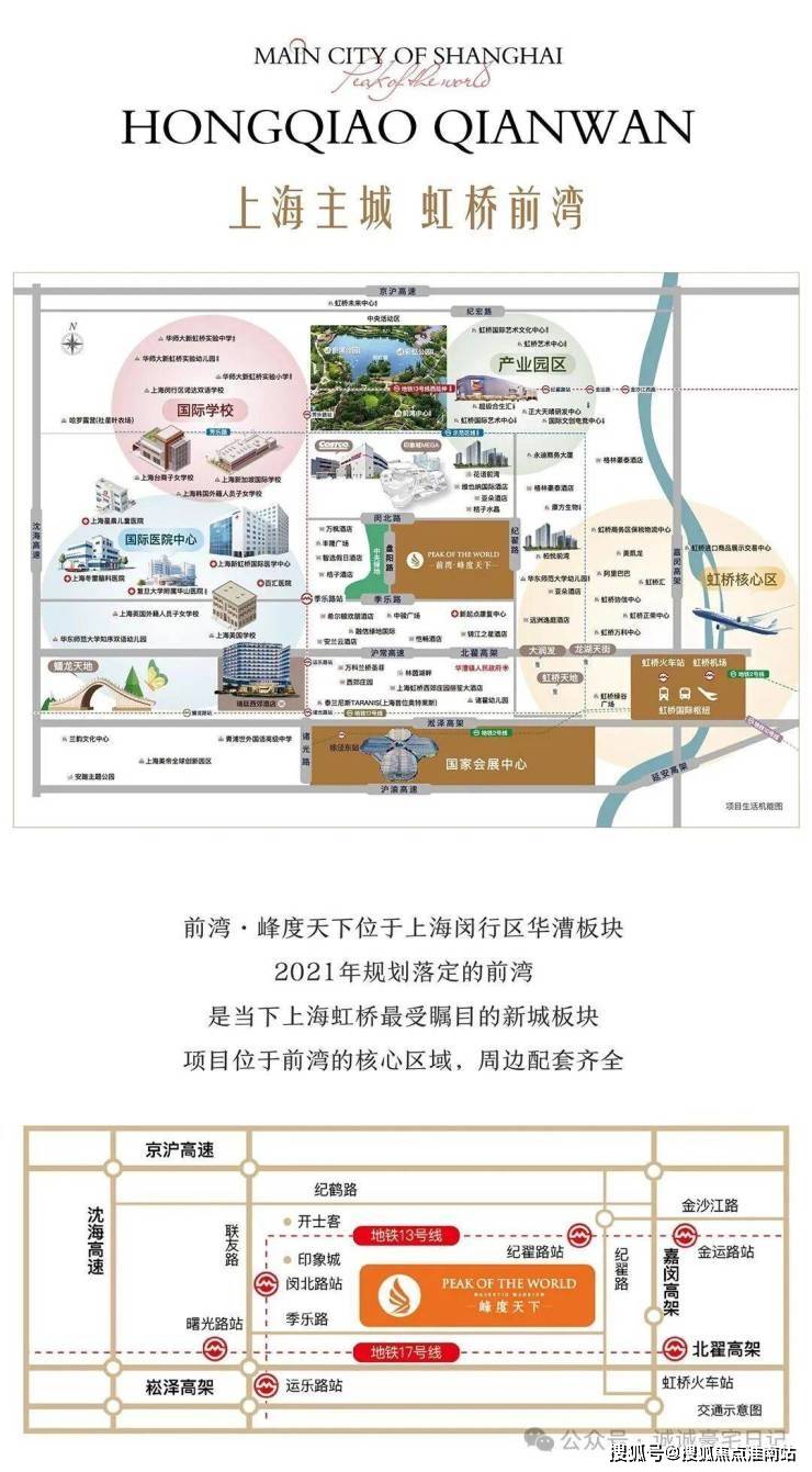 OCR:IMG:MAINCITYOFSHANGHAI HONGQIAOQIANWAN 上海主城虹桥前湾 尼宏路 华大新加外买验中学 国艺术文化中心 艺中心 华海大新机桥买验动儿器 产业园区 上海民行区请达政酒学校 华大全 G 增多出社星衣场 国际学校 H国艺水中心 国际文电中心 格 维台际酒店 花能 上海转民齐随人由子 型 格基酒 上A星儿集医 格子小品 方生 国际医院中心 万收 广场 红价高民品询 选目酒店 福 RR龙 品具水交据中心 上 格子滋 关下 上海号出 OACER 学东大学地器 巴 6INE 虹桥核心区 大学 单乐路 亚业通 国中心 上海页国外题人员子女学校 中广场 O中心 证xa 正类中心 华尔的路大学刻享营证动儿楼 酒 W2店 EMS中心 泸常高速 北程高架 大调厦龙湿天街 龙天油 万 中津人民用 虹桥火车站虹桥机场 西在器 上海大 王特天始 RO S 06 1 谢装动儿器 桥国际柜话 兰文化中心 DeRren 2 上海美企球品 国家会展中心 安国业路设 项目生活机能围 前湾·峰度天下位于上海闵行区华漕板块 2021年规划落定的前湾 是当下上海虹桥最受瞩目的新城板块 项目位于前湾的核心区域,周边配套齐全 京沪高速 纪鹤路 沈海高速 金沙江路 联友路 开士客 地铁13号线 印象城 纪翟路站 纪翟路 嘉闵高架 金运路站 闵北路站 PEAKOFTHEWORLD 季乐路 蜂度天下 曙光路站 M 地铁17号线 北瞿高架 崧泽高架 运乐路站 虹桥火车站 交通示意图 公众 搜狐号@搜亚焦点淮南站 活用