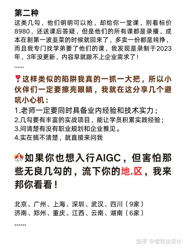 OCR:IMG:第二种 这类几勾,他们明明可以抢,却给你一堂课,别看标价 8980,还送课后答疑,但是他们的所有课都是录播,成 本在割第一波韭菜的时候就回来了,多卖一份都是纯挣, 而且我专门找学弟要了他们的课,我发现是录制于2023 年,3年没更新,内容早就跟不上企业需求了! ..... ?这样类似的陷阱我真的一抓一大把,所以小 伙伴们一定要擦亮眼睛,我就在这分享几个避 小心机: 1.老师一定要同时具备业内经验和技术实力; 2.几勾要有丰富的实战项目,能让学员积累实践经验; 3.问清楚有没有职业规划和企业推见。 4.实在搞不清楚,就直接来问我 如果你也想入行AIGC,但害怕那 些无良几勾的,流下你的地.区,我来 邦你看看! 北京、广州、上海、深圳、武汉、四川(9家) 济南、郑州、重庆、江西、云南、湖南(6家) 知乎@老铁说设计