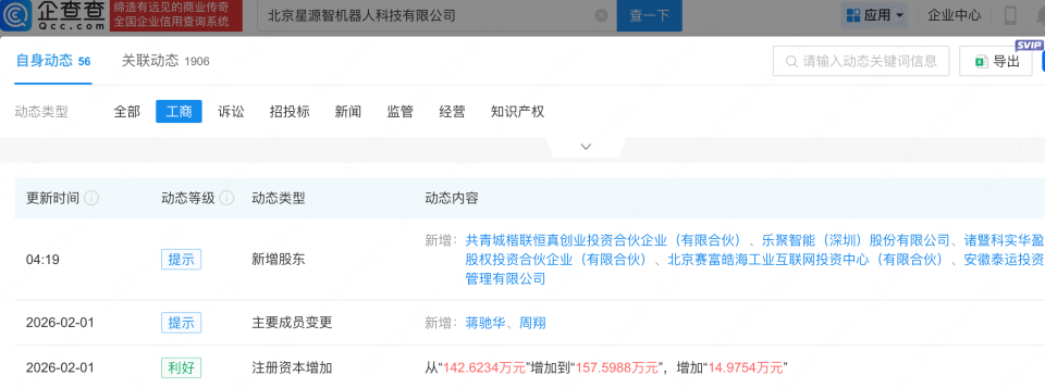 OCR:IMG:企查查 见的商业传奇 全国企业信用查询系统 北京星源智机器人科技有限公司 查一下 应用 企业中心 国 SVIP 自身动态56 关联动态1906 Q请输入动态关键词信息 导出 动态类型 全部 工商 诉讼 招投标 新闻 监管 经营 知识产权 更新时间① 动态等级 O 动态类型 动态内容 新增:共青城楷联恒真创业投资合伙企业(有限合伙)、乐聚智能(深圳)股份有限公司、诸暨科实华盈 04:19 提示 新增股东 股权投资合伙企业(有限合伙)、北京赛富皓海工业互联网投资中心(有限合伙)、安 安徽泰运投资 管理有限公司 2026-02-01 提示 主要成员变更 新增:蒋驰华、周翔 2026-02-01 利好 注册资本增加 从“142.6234万元增加到157.5988万元”,增加14.9754万元”