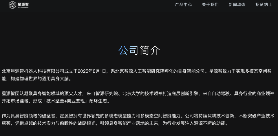 OCR:IMG:网 星源智 产品中心 关于我们 新闻动态 招贤纳士 公司简介 北京星源智机器人科技有限公司成立于2025年8月1日,系北京智源人工智能研究院孵化的具身智能公司。星源智致力于实现多模态空间智 能,构建物理世界的通用具身大脑。 星源智团队凝聚具身智能领域的顶尖人才,来自智源研究院、北京大学的技术领袖打造底层创新引擎,来自自动驾驶、具身行业的商业领袖 开拓市场疆域,形成技术壁垒+商业变现闭环生态。 作为具身智能领域的破壁者,星源智拥有世界领先的多模态模型能力和多模态空间智能能力。公司将持续深耕技术创新,不断突破产业技术 瓶颈,凭借卓越的技术实力与前瞻性的战略眼光,引领具身智能产业落地的未来,为行业发展注入源源不断的动能。