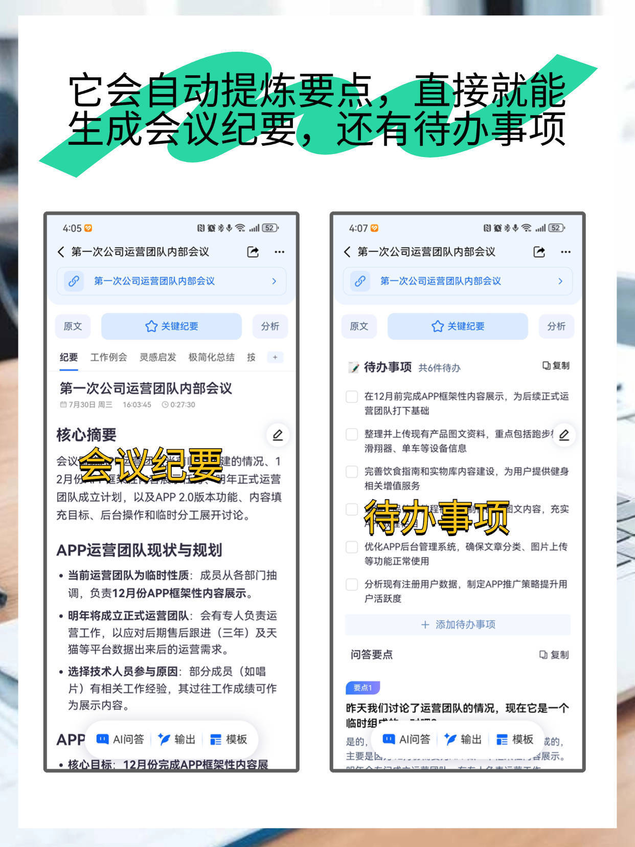 OCR:IMG:它会自动提炼要点,直接就能 生成会议纪要,还有待办事项 4:05 目52 4:07 目 <第一次公司运营团队内部会议 口 <第一次公司运营团队内部会议 D 第一次公司运营团队内部会议 第一次公司运营团队内部会议 原文 关键纪要 分析 原文 关键纪要 分析 纪要 工作例会 灵感启发 极简化总结 按 待办事项共6件待办 复制 第一次公司运营团队内部会议 16:03450027:30 在12月前完成APP框架性内容展示,为后续正式运 口7月30日 周三 营团队打下基础 核心摘要 0 整理并上传现有产品图文资料,重点包括跑步! 会议纪要 滑翔器、单车等设备信息 会议 建的情况、1 2月 月年正式运营 完善饮食指南和实物库内容建设,为用户提供健身 团队成立计划,以及APP2.0版本功能、内容填 相关增值服务 待办事项 充目标、后台操作和临时分工展开讨论。 文内容,充实 APP运营团队现状与规划 优化APP后台管理系统,确保文章分类、图片上传 等功能正常使用 ·当前运营团队为临时性质:成员从各部门抽 分析现有注册用户数据,制定APP推广策略提升用 调,负责12月份APP框架性内容展示 户活跃度 ·明年将成立正式运营团队:会有专人负责运 营工作,以应对后期售后跟进(三年)及天 十添加待办事项 猫等平台数据出来后的运营需求。 问答要点 复制 ·选择技术人员参与原因:部分成员(如唱 片)有相关工作经验,其过往工作成绩可作 要点1 为展示内容。 昨天我们讨论了运营团队的情况,现在它是一个 APP AI问答 输出 模板 是的, A问答 输出 模板 花的 核心目标:12月份完成APP框架性内容展 主要是b 展示。