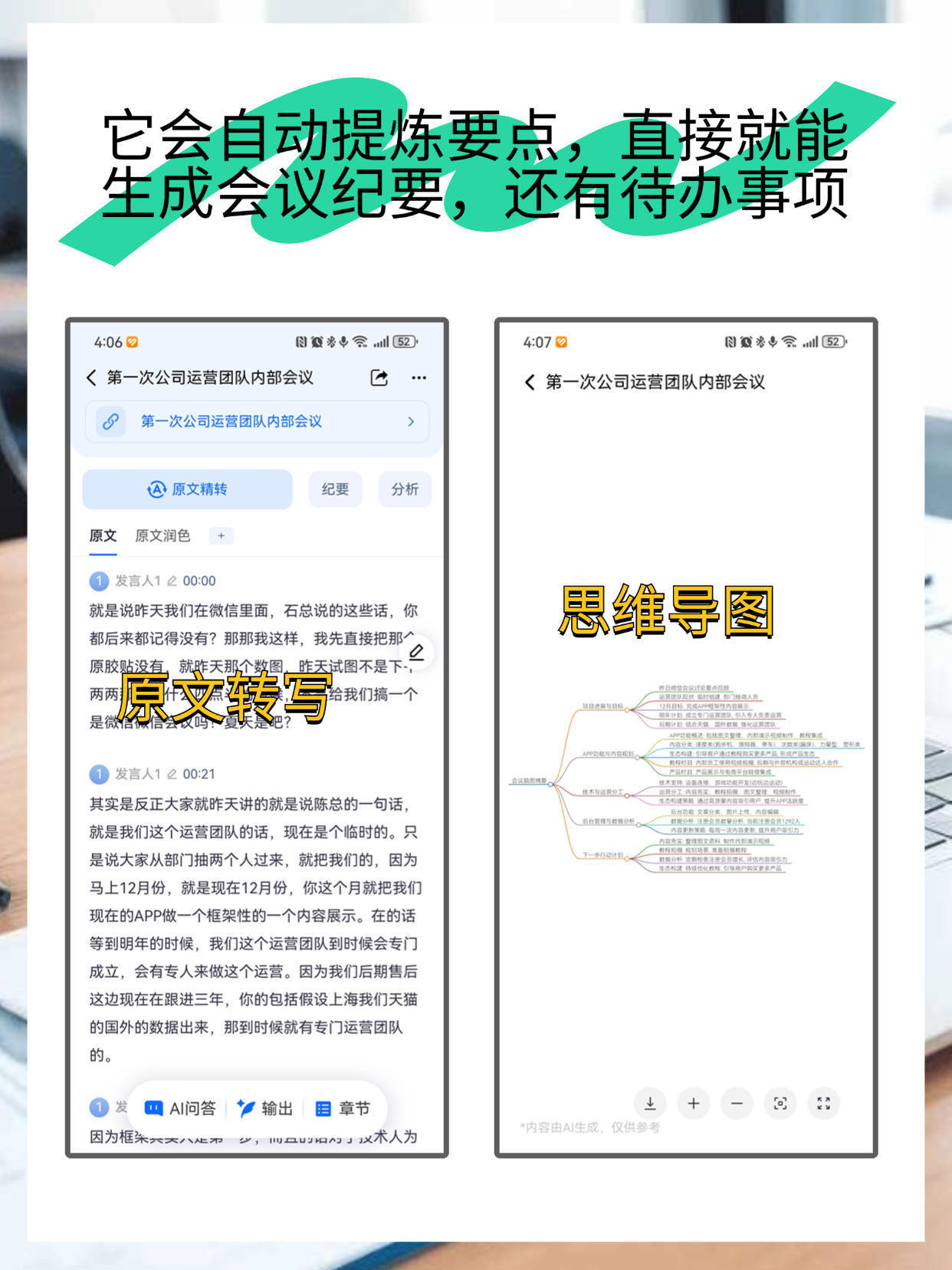 OCR:IMG:它会自动提炼要点,直接就能 生成会议纪要,还有待办事项 4:06 目5 4:07 目2 <第一次公司运营团队内部会议 L <第一次公司运营团队内部会议 达 第一次公司运营团队内部会议 原文精转 纪要 分析 原文 原文润色 发言人100:00 思维导图 就是说昨天我们在微信里面,石总说的这些话,你 都后来都记得没有?那那我这样,我先直接把那 原胶贴没有 就昨天那个数图,昨天试图不是下 0 原文转写 两两 合我们搞一个 福 发言人100:21 其实是反正大家就昨天讲的就是说陈总的一句话, 就是我们这个运营团队的话,现在是个临时的。只 是说大家从部门抽两个人过来,就把我们的,因为 马上12月份,就是现在12月份,你这个月就把我们 现在的APP做一个框架性的一个内容展示。在的话 等到明年的时候,我们这个运营团队到时候会专门 成立,会有专人来做这个运营。因为我们后期售后 这边现在在跟进三年,你的包括假设上海我们天猫 的国外的数据出来,那到时候就有专门运营团队 的。 AI问答 输出 目章节 M + C 出 因为框东共天八起带 :且议术人为 内容由AI生成仅供考