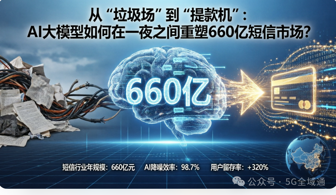 OCR:IMG:从“垃圾场”到“提款机”: AI大模型如何在一夜之间重塑660亿短信市场? 660亿 短信行业年规模:660亿元 AI降噪效率:98.7% 用户留存率:+320% 2 公众号·5G全域通
