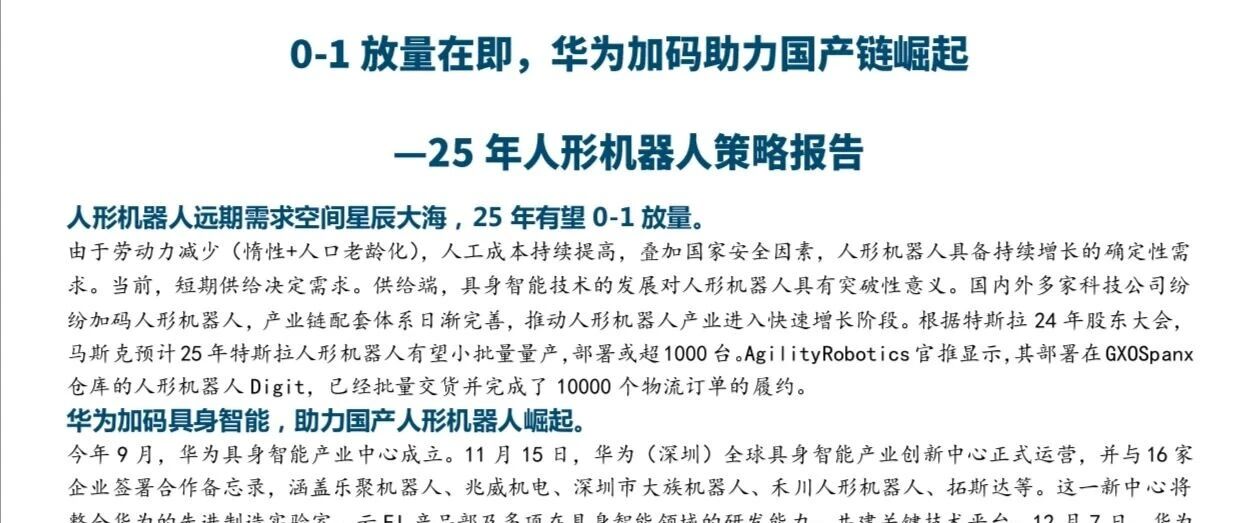 【完整版“20”页:为了方便大家系统长期下载,一起学习进步,特意把机器人资料都汇集在知识星球,进入就能下载,包括历史往期的,每天都会更新两篇。一次加入管一年每天可以下载,几十块用起来很方便: 1️⃣星球用户在星球APP搜索“2025年人形机器人策略报告:0-1放量在即,华为加码助力国产链崛起.pdf”,2️⃣非星球用户查看入口下载说明及机器人智库星球介绍,有疑问添加v:guihuayuguihua】