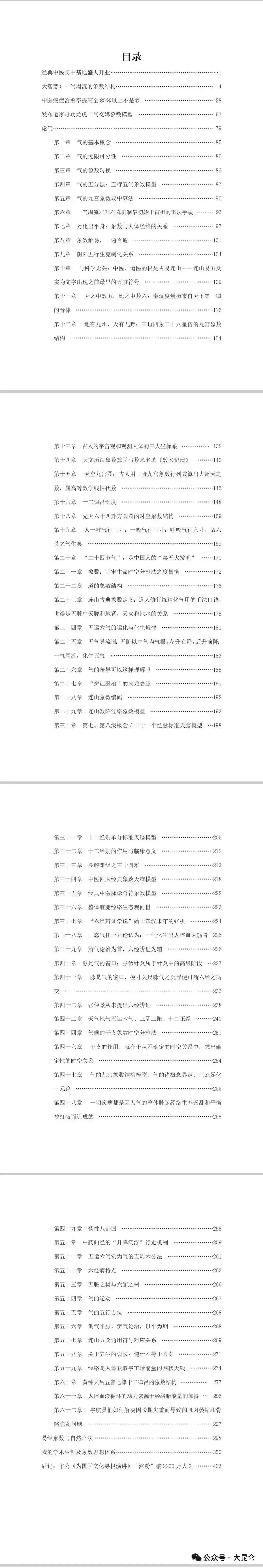 OCR:IMG:第五十六章调气平脉,辨气论治,以平为期…268 第五十七章连山五交通用符号对应关系 .269 第五十八章关于养生的误区:健壮不等于长寿 第五十九章经络是人体获取宇宙暗能量的网状天线 ..274 第六十章黄钟大吕五音七律十二律吕的象数结构 277 第六十一章人体血液循环的动力来源于经络暗能量的加持296 第六十二章宇航员们如何解决因长期失重而导致的肌肉萎缩和骨 骼脆弱问题 易经象数与自然疗法 我的学术生涯及象数思想体系 后记:卡公《为国学文化寻根演讲》“涨粉”破2200万大关403 公众号·大昆仑