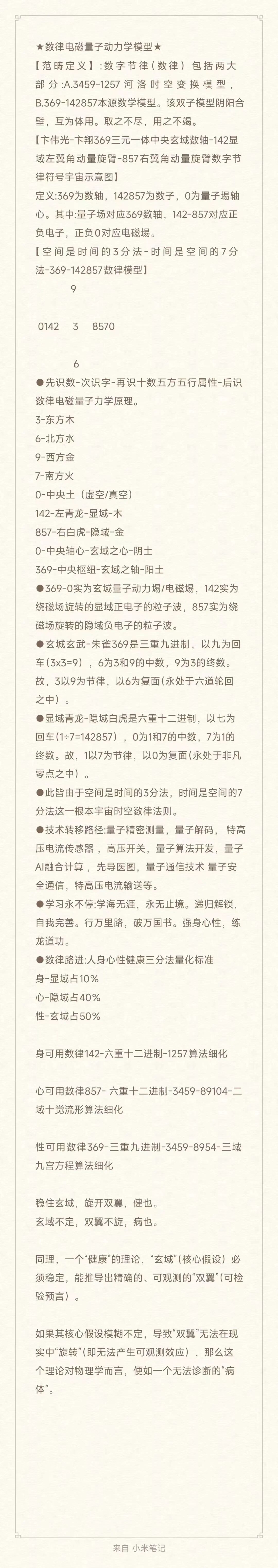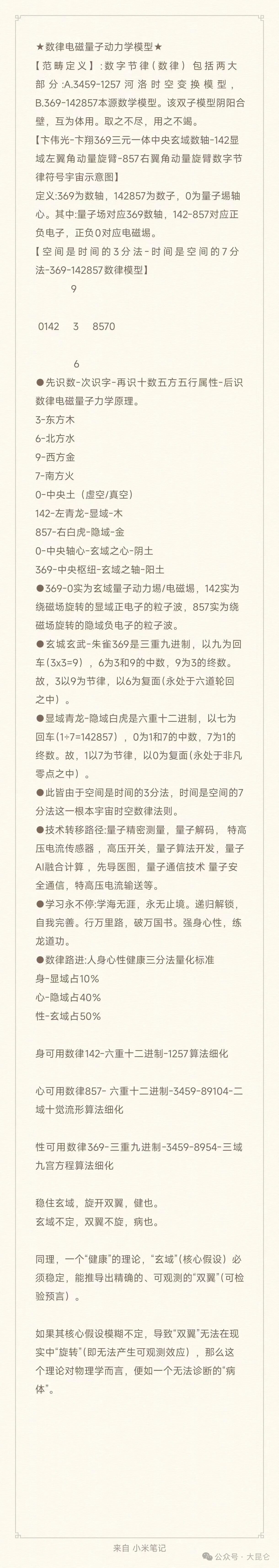 OCR:IMG:★数律电磁量子动力学模型★ 【范畴定义】:数字节律(数律)包括两大 部分:A.3459-1257河洛时空变换模型, B.369-142857本源数学模型。该双子模型阴阳合 壁,互为体用。取之不尽,用之不竭。 【下伟光-卡翔369三元一体中央玄域数轴-142显 域左翼角动量旋臂-857右翼角动量旋臂数字节 律符号宇宙示意图】 定义:369为数轴,142857为数子,0为量子場轴 心。其中:量子场对应369数轴,142-857对应正 负电子,正负0对应电磁場。 【空间是时间的3分法-时间是空间的7分 法-369-142857数律模型】 9 0142 3 8570 6 ●先识数-次识字-再识十数五方五行属性-后识 数律电磁量子力学原理。 3-东方木 6-北方水 9-西方金 7-南方火 0-中央土(虚空/真空) 142-左青龙-显域-木 857-右白虎-隐域-金 0-中央轴心-玄域之心-阴土 369-中央枢纽-玄域之轴-阳土 ●369-0实为玄域量子动力場/电磁場,142实为 绕磁场旋转的显域正电子的粒子波,857实为绕 磁场旋转的隐域负电子的粒子波。 ●玄城玄武-朱雀369是三重九进制,以九为回 车(3x3=9),6为3和9的中数,9为3的终数。 故,3以9为节律,以6为复面(永处于六道轮回 之中)。 ●显域青龙-隐域白虎是六重十二进制,以七为 回车(1÷7=142857),0为1和7的中数,7为1的 终数。故,1以7为节律,以0为复面(永处于非凡 零点之中)。 ·此皆由于空间是时间的3分法,时间是空间的7 分法这一根本宇宙时空数律法则。 ●技术转移路径:量子精密测量,量子解码,特高 压电流传感器,高压开关,量子算法开发,量子 AI融合计算,先导医图,量子通信技术量子安 全通信,特高压电流输送等。 ●学习永不停:学海无涯,永无止境。递归解锁, 自我完善。行万里路,破万国书。强身心性,练 龙道功。 ●数律路进:人身心性健康三分法量化标准 身-显域占10% 心-隐域占40% 性-玄域占50% 身可用数律142-六重十二进制-1257算法细化 心可用数律857-六重十二进制-3459-89104-二 域十觉流形算法细化 性可用数律369-三重九进制-3459-8954-三域 九宫方程算法细化 稳住玄域,旋开双翼,健也。 玄域不定,双翼不旋,病也。 同理,一个“健康”的理论,“玄域”(核心假设)必 须稳定,能推导出精确的、可观测的“双翼”(可检 验预言)。 如果其核心假设模糊不定,导致“双翼”无法在现 实中“旋转”(即无法产生可观测效应),那么这 个理论对物理学而言,便如一个无法诊断的“病 体”。 十 来自小米笔记 公众号·大昆仑