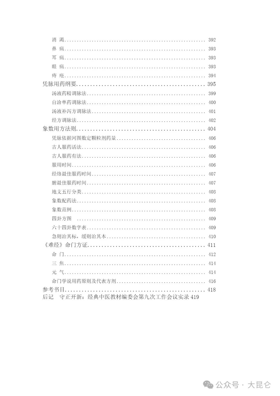 OCR:IMG:消渴. 392 鼻病 393 耳病 393 眼病.... 393 痔疮.... 394 凭脉用药纲要. 395 汤液药精调脉法 399 自洽单药调脉法. 400 汤液补泻方调脉法. 401 经方调脉法。 402 象数用方法则. 404 凭脉依据河图数定颗粒剂药量... 406 古人服药活法, 406 古人服药有法 406 服用时间 406 经络最佳服药时间 407 腑最佳服药时间 407 地支五行分类。 108 象数配药法. 408 象数范例. 108 四卦方图 409 六十四卦数字表, 409 急则治其标,缓则治其本 410 《难经》命门方证 411 命门 412 三焦 414 元气.. 414 命门学说用药原则及代表方剂、 416 参考书目.. 418 后记守正开新:经典中医教材编委会第九次工作会议实录419 公众号·大昆仑