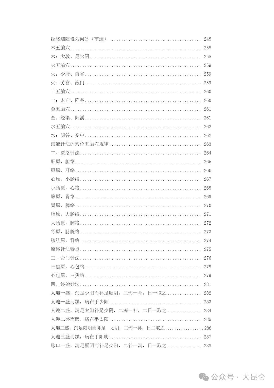 OCR:IMG:经络迎随设为问答(节选) 248 木五输穴 258 木:大敦、足窍阴 258 火五输穴. 259 火:少府、前谷... 259 火:劳宫、液门. 259 土五输穴 260 土:太白、陷谷, 260 金五输穴 261 金:经渠、阳溪、 261 水五输穴 262 水:阴谷、委中. 262 汤液针法的穴位五输穴规律。 263 二、原络针法、 264 肝原,胆络.. 265 胆原,肝络.. 266 心原,小肠络 267 小肠原,心络 268 肿原,胃络. 269 胃原,脾络.. 270 肺原,大肠络 271 大肠原,肺络。 272 肾原,膀胱络. 273 膀胱原,肾络 274 原络针法特点. 275 三、命门针法 276 三焦原,心包络 278 心包原,三焦络 279 四、终始针法。 281 人迎一盛,泻足少阳而补足厥阴,二泻一补,日一取之 282 人迎一盛面躁,病在手少阳。 283 人迎二盛,泻足太阳补足少阴,二泻一补,二日一取之 284 人迎二盛面躁,病在手太阳. 285 人迎三盛,泻足阳明面补足太阴,二泻一补,日二取之 286 人迎三盛面躁,病在手阳明. 287 脉口一盛,泻足厥阴而补足少阳,二补一泻,日一取之, 288 公众号·大昆仑
