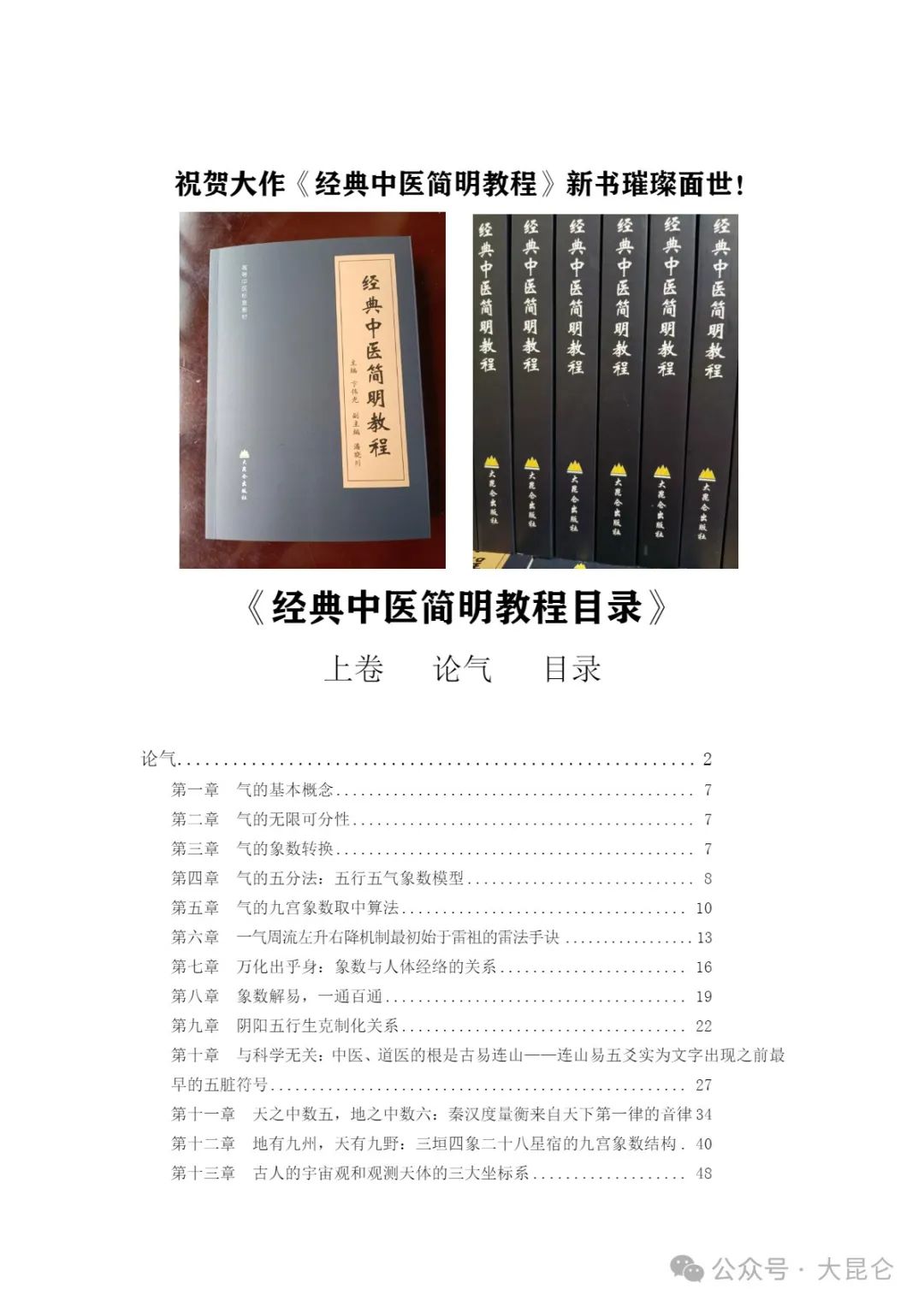 OCR:IMG:祝贺大作《经典中医简明教程》新书璀璨面世! 2 经典中医简明教程 共中 典中医简明教程 典中医简明教 经典中医简明教程 简明救程 5 教程 程 《经典中医简明教程目录》 上卷论气目录 论气... 第一章 气的基本概念 第二章 气的无限可分性, 第三章 气的象数转换. 第四章 气的五分法:五行五气象数模型 第五章 气的九宫象数取中算法 10 第六章 一气周流左升右降机制最初始于需祖的需法手诀 13 第七章 万化出乎身:象数与人体经络的关系 16 第八章 象数解易,一通百通 1.9 第九章阴阳五行生克制化关系 22 第十章与科学无关:中医、道医的根是古易连山一一连山易五交实为文字出现之前最 早的五脏符号... 27 第十一章天之中数五,地之中数六:秦汉度量衡来自天下第一律的音律34 第十二章地有九州,天有九野:三垣四象二十八星宿的九宫象数结构。40 第十三章古人的宇宙观和观测天体的三大坐标系..... 48 公众号·大昆仑