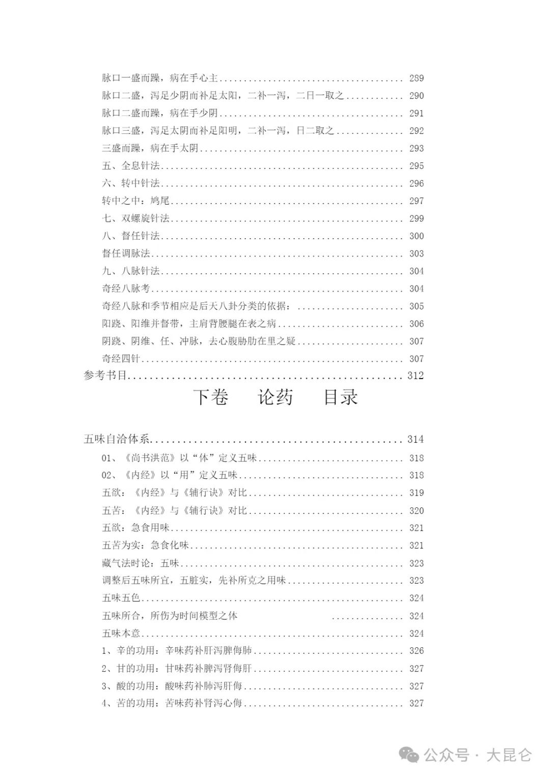 OCR:IMG:脉口一盛面躁,病在手心主。 289 脉口二盛,泻足少阴面补足太阳,二补一泻,二日一取之 290 脉口二盛面躁,病在手少阴.. 291 脉口三盛,泻足太阴而补足阳明,二补一泻,日二取之.. 292 三盛而躁,病在手太阴。 293 五、全息针法.. 295 六、转中针法 296 转中之中:鸠尾 297 七、双螺旋针法 299 八、督任针法、 300 督任调脉法。 303 九、八脉针法、 304 奇经八脉考 304 奇经八脉和季节相应是后天八卦分类的依据: 305 阳晓、阳维并督带,主肩背腰腿在表之病 306 阴晓、阴维、任、冲脉,去心腹胁肋在里之疑。 307 奇经四针 307 参考书日. 312 下卷 论药 目录 五味自洽体系.. 314 01、《尚书洪范》以“体”定义五味 318 02、《内经》以“用”定义五味 318 五欲:《内经》与《辅行诀》对比.. 319 五苦:《内经》与《辅行诀》对比.. 320 五欲:急食用味 321 五苦为实:急食化味 321 藏气法时论:五味, 323 调整后五味所宜,五脏实,先补所克之用味 323 五味五色 324 五味所合,所伤为时间模型之体 324 五味本意 324 1、辛的功用:辛味药补肝泻脾侮肺 326 2、甘的功用:甘味药补脾泻肾侮肝 327 3、酸的功用:酸味药补肺泻肝侮 327 4、苦的功用:苦味药补肾泻心悔 327 公众号·大昆仑