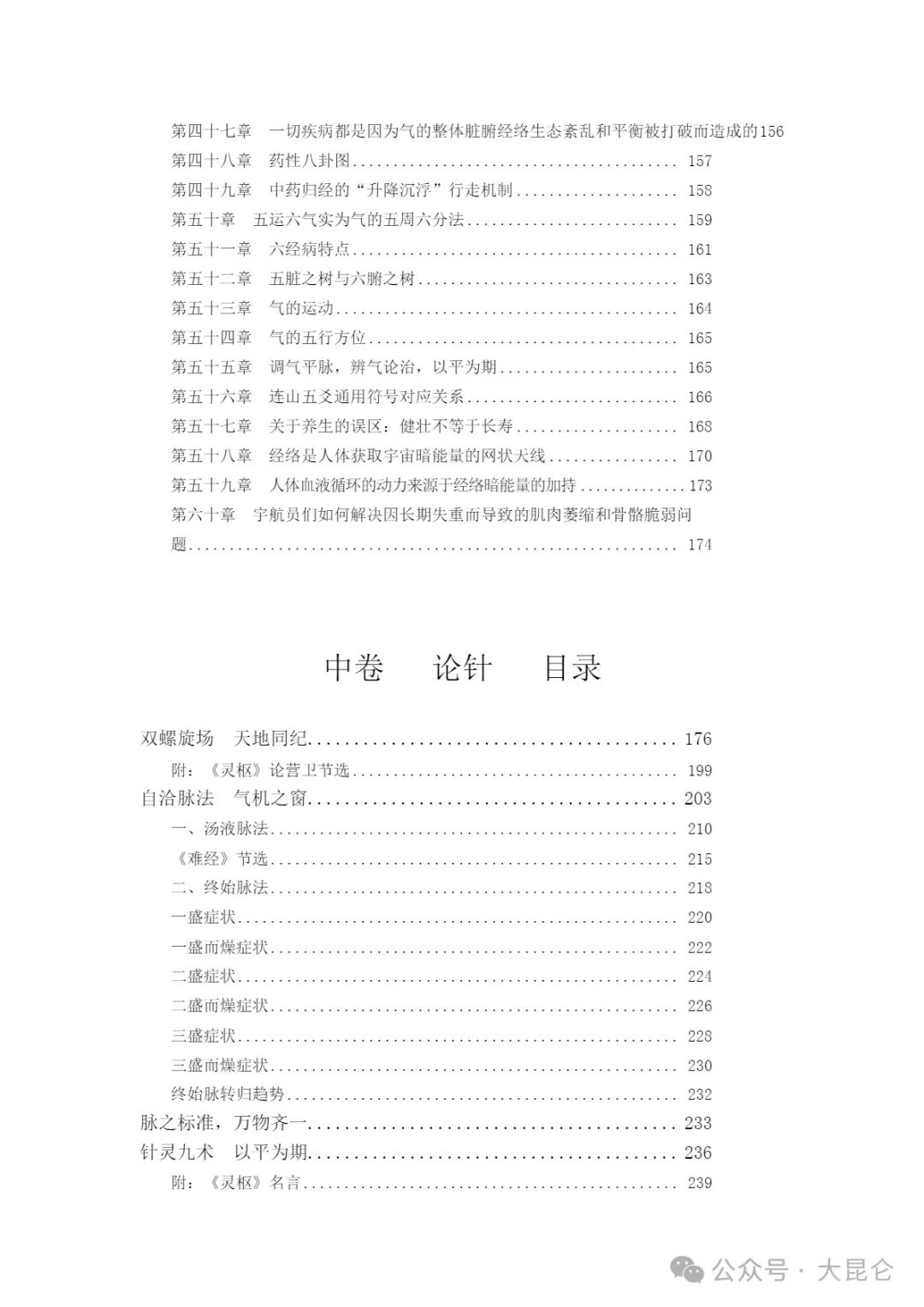 OCR:IMG:第四十七章一切疾病都是因为气的整体脏腑经络生态紊乱和平衡被打破而造成的156 第四十八章药性八卦图 157 第四十九章中药归经的“升降沉浮”行走机制 158 第五十章五运六气实为气的五周六分法 159 第五十一章六经病特点. 161 第五十二章 五脏之树与六腑之树.. 163 第五十三章 气的运动 164 第五十四章 气的五行方位 165 第五十五章 调气平脉,辨气论治,以平为期 165 第五十六章连山五交通用符号对应关系 166 第五十七章关于养生的误区:健壮不等于长寿 168 第五十八章经络是人体获取宇宙暗能量的网状天线 170 第五十九章人体血液循环的动力来源于经络暗能量的加持 173 第六十章宇航员们如何解决因长期失重面导致的肌肉萎缩和骨骼脆弱问 174 中卷论针目录 双螺旋场天地同纪... 176 附:《灵枢》论营卫节选 199 自洽脉法气机之窗, 203 一、汤液脉法 210 《难经》节选 215 二、终始脉法。 218 一盛症状 220 一盛而燥症状. 222 二盛症状 224 二盛而煤症状, 226 三盛症状 228 三盛而燥症状. 230 终始脉转归趋势 232 脉之标准,万物齐 233 针灵九术以平为期. 236 附:《灵枢》名言 239 公众号·大昆仑