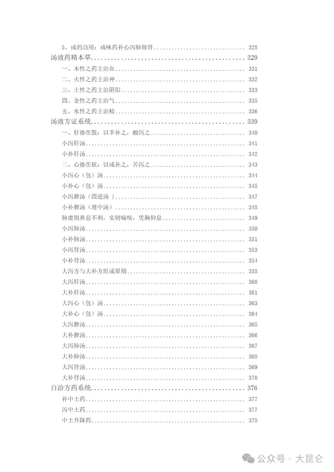 OCR:IMG:5、咸的功用:或味药补心泻肺侮肾 328 汤液药精本草. 329 一、木性之药主治血。 331 二、火性之药主治神... 332 三、土性之药主治阴阳, 333 四、金性之药主治气 335 五、水性之药主治精 336 汤液方证系统.. 、肝德在散:以辛补之,酸泻之, 340 小泻肝汤 341 小补肝汤 342 二、心德在软:以成补之,苦泻之. 343 小泻心(包)汤 344 小补心(包)汤 345 小泻脾汤(四逆汤)。 347 小补脾汤(理中汤) 348 肺虚则鼻息不利,实则喘咳,凭胸仰息 349 小泻肺汤 350 小补肺汤 351 小泻肾汤, 353 小补肾汤 354 大泻方与大补方组成原则, 358 大泻肝汤。 360 大补肝汤 361 大泻心(包)汤 363 大补心(包)汤 364 大泻脾汤 365 大补脾汤 366 大泻肺汤。 367 大补肺汤。 368 大泻肾汤. 369 大补肾汤。 370 自洽方药系统 376 补中土药 377 泻中土药 377 中土升降药 378 公众号·大昆仑