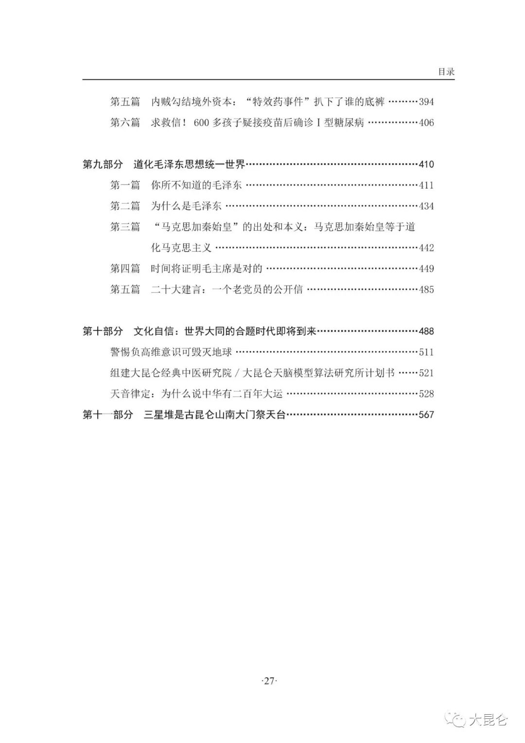 OCR:IMG:目录 第五篇内贼勾结境外资本:“特效药事件”扒下了谁的底裤394 第六篇求救信!600多孩子疑接疫苗后确诊1型糖尿病406 第九部分道化毛泽东思想统一世界 ...410 第一篇你所不知道的毛泽东 ·411 第二篇为什么是毛泽东 434 第三篇“马克思加秦始皇”的出处和本义:马克思加秦始皇等于道 化马克思主义 第四篇 时间将证明毛主席是对的 ***449 第五篇二十大建言:一个老党员的公开信· -485 第十部分文化自信:世界大同的合题时代即将到来 488 警惕负高维意识可毁灭地球. 51 组建大昆仑经典中医研究院/大昆仑天脑模型算法研究所计划书521 天音律定:为什么说中华有二百年大运 528 第十一部分三星堆是古昆仑山南大门祭天台 ..567 27 大昆仑