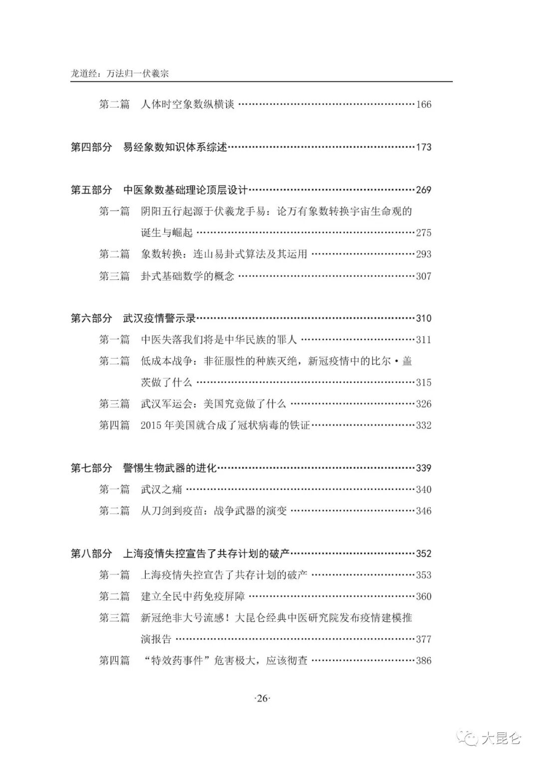 OCR:IMG:龙道经:万法归一伏羲宗 第二篇人体时空象数纵横谈 第四部分易经象数知识体系综述 173 第五部分中医象数基础理论顶层设计 **.269 第一篇阴阳五行起源于伏羲龙手易:论万有象数转换宇宙生命观的 诞生与起… ....275 第二篇象数转换:连山易卦式算法及其运用 第三篇卦式基础数学的概念 307 第六部分武汉疫情警示录 ...310 第一篇中医失落我们将是中华民族的罪人 .*·311 第二篇低成本战争:非征服性的种族灭绝,新冠疫情中的比尔·盖 茨做了什么… ...315 第三篇武汉军运会:美国究竞做了什么 第四篇2015年美国就合成了冠状病毒的铁证 第七部分警惕生物武器的进化 第一篇武汉之痛 ..340 第二篇从刀剑到疫苗:战争武器的演变 .346 第八部分上海疫情失控宣告了共存计划的破产 第一篇上海疫情失控宣告了共存计划的破产 353 第二篇建立全民中药免疫屏障 360 第三篇 新冠绝非大号流感!大昆仑经典中医研究院发布疫情建模推 演报告 `377 第四篇 “特效药事件”危害极大,应该彻查 386 26- 大昆仑