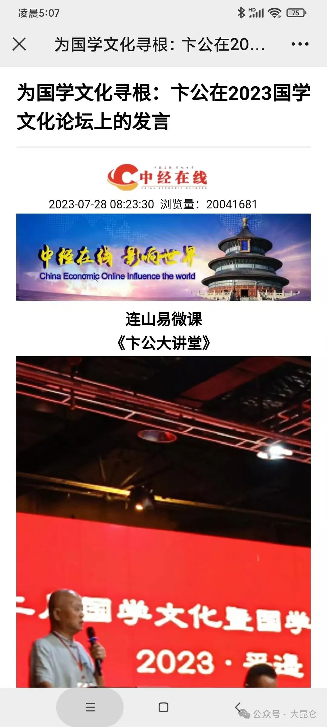 OCR:IMG:凌晨5:07 5 X 为国学文化寻根:卞公在20... 为国学文化寻根:卞公在2023国学 文化论坛上的发言 中经在线 2023-07-2808:23:30 浏览量:20041681 中经在线影响世界 ChinaEconomicOnlineInfluencetheworld 理 连山易微课 《卞公大讲堂》 人国学文化壹国学 2023·平遇 公众号·大昆仑