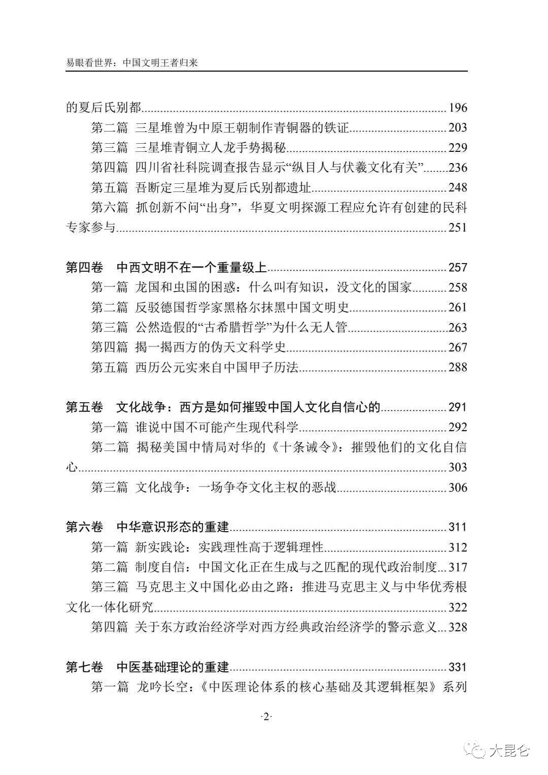 OCR:IMG:易眼看世界:中国文明王者归来 的夏后氏别都 196 第二篇三星堆曾为中原王朝制作青铜器的铁证 203 第三篇三星堆青铜立人龙手势揭秘 229 第四篇四川省社科院调查报告显示“纵目人与伏羲文化有关”.236 第五篇吾断定三星堆为夏后氏别都遗址 248 第六篇抓创新不问“出身”,华夏文明探源工程应允许有创建的民科 专家参与. 251 第四卷中西文明不在一个重量级上 257 第一篇龙国和虫国的困惑:什么叫有知识,没文化的国家 .258 第二篇反驳德国哲学家黑格尔抹黑中国文明史 261 第三篇公然造假的“古希腊哲学”为什么无人管 .263 第四篇揭一揭西方的伪天文科学史 267 第五篇西历公元实来自中国甲子历法 288 第五卷文化战争:西方是如何摧毁中国人文化自信心的 291 第一篇谁说中国不可能产生现代科学 292 第二篇揭秘美国中情局对华的《十条诚令》:摧毁他们的文化自信 303 第三篇文化战争:一场争夺文化主权的恶战 306 第六卷中华意识形态的重建 311 第一篇新实践论:实践理性高于逻辑理性 312 第二篇制度自信:中国文化正在生成与之匹配的现代政治制度.317 第三篇马克思主义中国化必由之路:推进马克思主义与中华优秀根 文化一体化研究 ..322 第四篇关于东方政治经济学对西方经典政治经济学的警示意义..328 第七卷中医基础理论的重建 331 第一篇龙吟长空:《中医理论体系的核心基础及其逻辑框架》系列 2 大昆仑