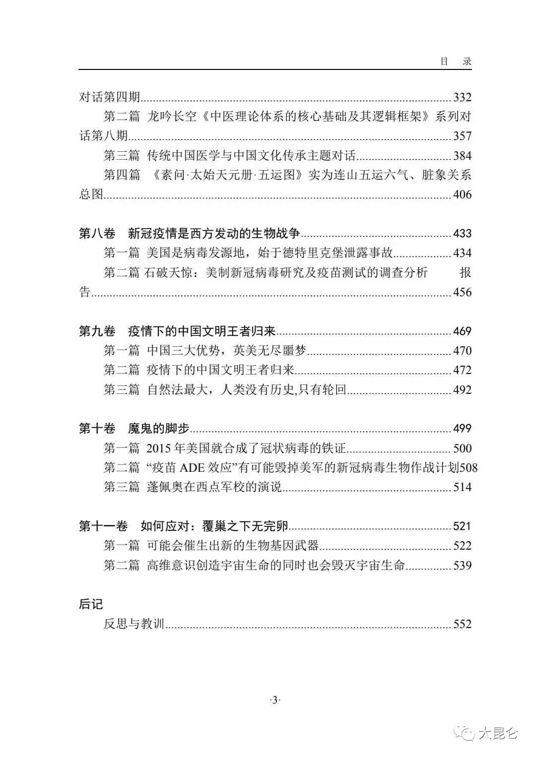 OCR:IMG:目 录 对话第四期 332 第二篇龙吟长空《中医理论体系的核心基础及其逻辑框架》系列对 话第八期.. 357 第三篇传统中国医学与中国文化传承主题对话 384 第四篇《素问·太始天元册·五运图》实为连山五运六气、脏象关系 总图 406 第八卷新冠疫情是西方发动的生物战争 433 第一篇美国是病毒发源地,始于德特里克堡泄露事故 434 第二篇石破天惊:美制新冠病毒研究及疫苗测试的调查分析 报 告. 456 第九卷疫情下的中国文明王者归来 469 第一篇中国三大优势,英美无尽噩梦 470 第二篇疫情下的中国文明王者归来 472 第三篇自然法最大,人类没有历史,只有轮回 492 第十卷魔鬼的脚步 499 第一篇2015年美国就合成了冠状病毒的铁证 500 第二篇“疫苗ADE效应”有可能毁掉美军的新冠病毒生物作战计划508 第三篇蓬佩奥在西点军校的演说 514 第十一卷如何应对:覆巢之下无完卵 521 第一篇可能会催生出新的生物基因武器 522 第二篇高维意识创造宇宙生命的同时也会毁灭宇宙生命. ..539 后记 反思与教训 552 3 大昆仑