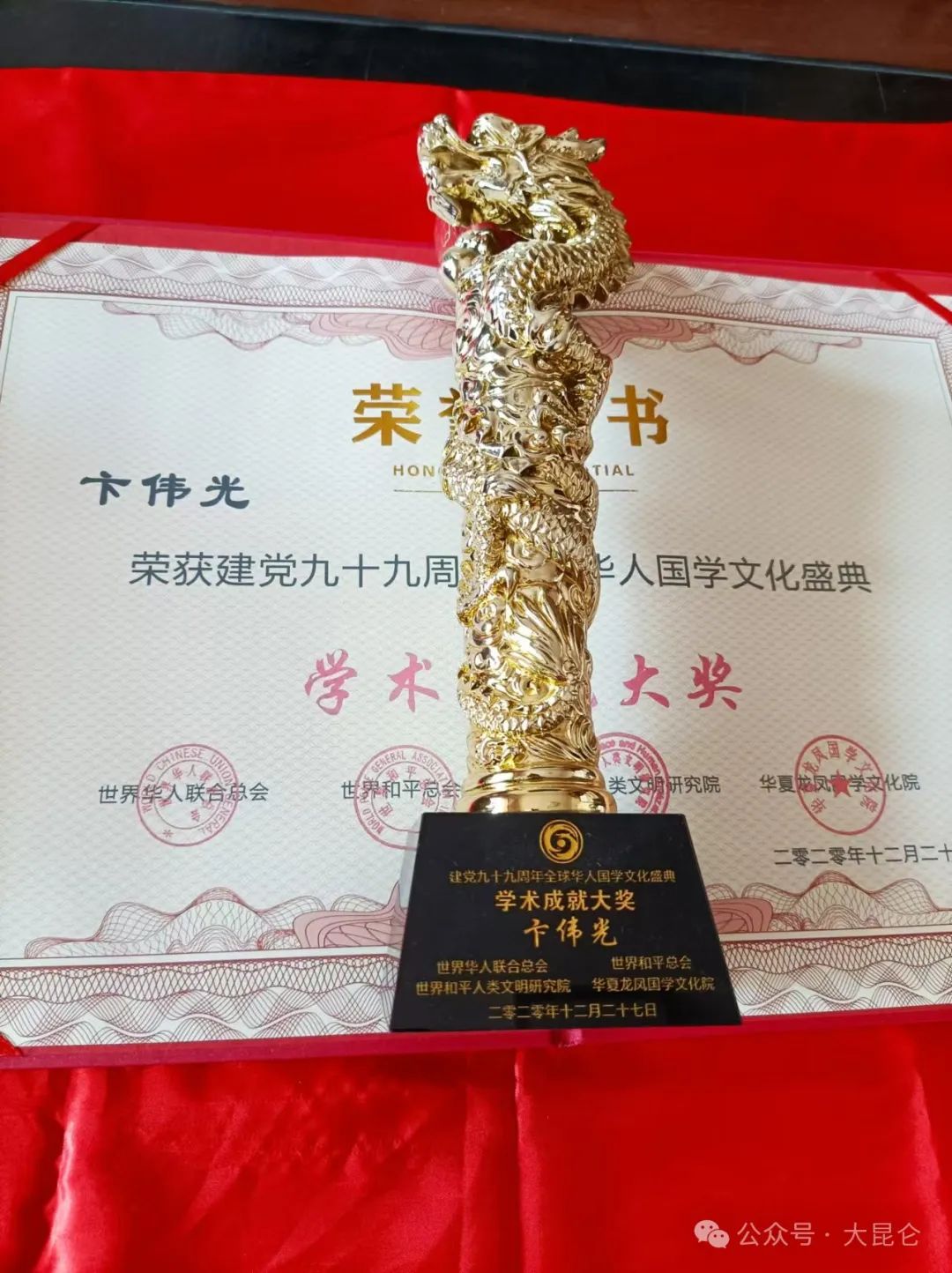 OCR:IMG:荣书 卡伟光 HONG 茶 TIAL 福 华人国学文化盛典 学术 大奖 ALEOE 9 良国卖 世界华人联合总会 世界和平总会 类文 开究院 华夏龙凤贵学文化院 福 二零二零年十二月二十 建党九十九周年全球华人国学文化盛典 学术成就大奖 卡伟光 世界华人联合总会 世界和平总会 世界和平入类文明研究院 华夏龙风国学文化院 二零二零年十二月二十七日 公众号·大昆仑