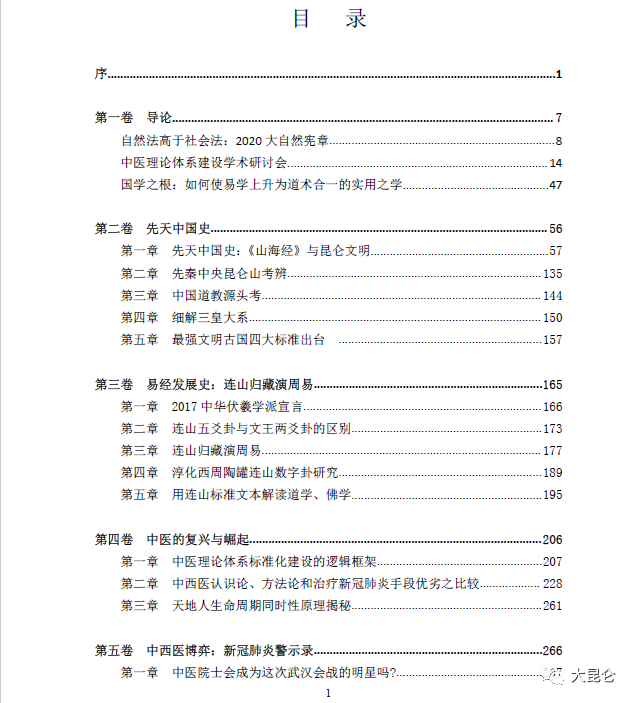 OCR:IMG:目 录 片 第一卷导论. 自然法高于社会法:2020大自然宪章 中 中医理论体系建设学术研讨会. 14 国学之根:如何使易学上升为道术合一的实用之学 47 第二卷先天中国史 56 第一章先天中国史:《山海经》与昆仑文明 .57 第二章先泰中央昆仑山考辨 135 第三章 中国道教源头考 144 第四章 细解三皇大系 150 第五章 最强文明古国四大标准出台 157 第三卷易经发展史:连山归藏演周易 165 第一章2017中华伏羲学派宣言 166 第二章连山五交卦与文王两交卦的区别 173 第三章 连山归藏演周易 177 第四章 淳化西周陶罐连山数字卦研究 189 第五章用连山标准文本解读道学、佛学 195 第四卷中医的复兴与崛起 206 第一章中医理论体系标准化建设的逻辑框架 207 第二章中西医认识论、方法论和治疗新冠肺炎手段优劣之比较 228 第三章天地人生命周期同时性原理揭秘 261 第五卷中西医博弈:新冠肺炎警示录. 266 第一章中医院士会成为这次武汉会战的明星吗? 大昆仑