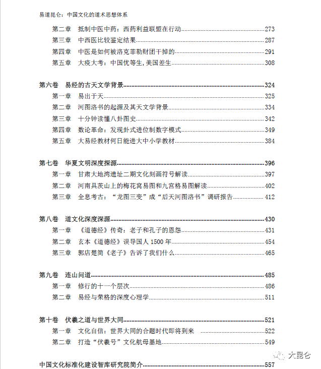 OCR:IMG:易道昆仑:中国文化的道术思想体系 第二章抵制中医中药:西药利益联盟在行动 273 第三章中西医比较鉴定结果 287 第四章中医是如何被洛克菲勒财团干掉的 291 第五章大疫大考:中国优等生,美国差生 308 第六卷易经的古天文学背景 324 第一章易出于天 325 第二章河图洛书的起源及其天文学背景 334 第三章十分钟读懂八卦图史 342 第四章数论革命:发现卦式进位制数字模式 349 第五章大易经教材何日能进大中小学教材 384 第七卷华夏文明深度探源 396 第一章甘肃大地湾遗址二期文化刻画符号解读 397 第二章河南具茨山上的梅花窝易图和九宫格易图解读 402 第三章全息考古:“龙图三变”成“后天河图洛书”调研报告 412 第八卷道文化深度深源. 430 第一章《道德经》传奇:老子和孔子的恩怨 431 第二章玄本《道德经》误导国人1500年 454 第三章郭店楚简《老子》告诉了我们什么 465 第九卷连山问道 485 第一章修行的十一个层次 486 第二章易经与荣格的深度心理学 511 第十卷伏羲之道与世界大同.. 521 第一章文化自信:世界大同的合题时代即将到来 522 第二章打造“伏羲号”文化航母基地 549 大昆仑 557