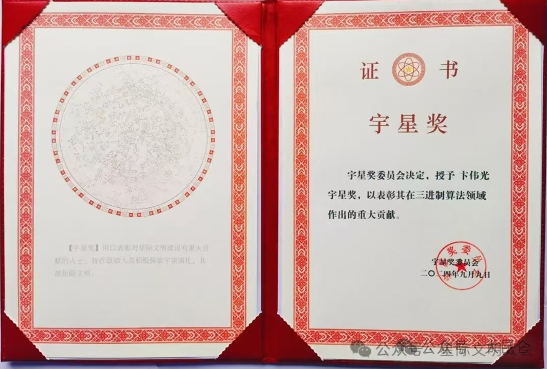 OCR:IMG:证 ® 书 宇星奖 福 宇星奖委员会决定,授子卡伟光 宇星奖,以表彰其在三进制算法领域 作出的重大贡献。 【学里奖】用以表对质际文明建设有单人额 果委 就的人下,在装动人类型极素于宙#化, 辛辅奖参员会 中际 二O 悬年九月日