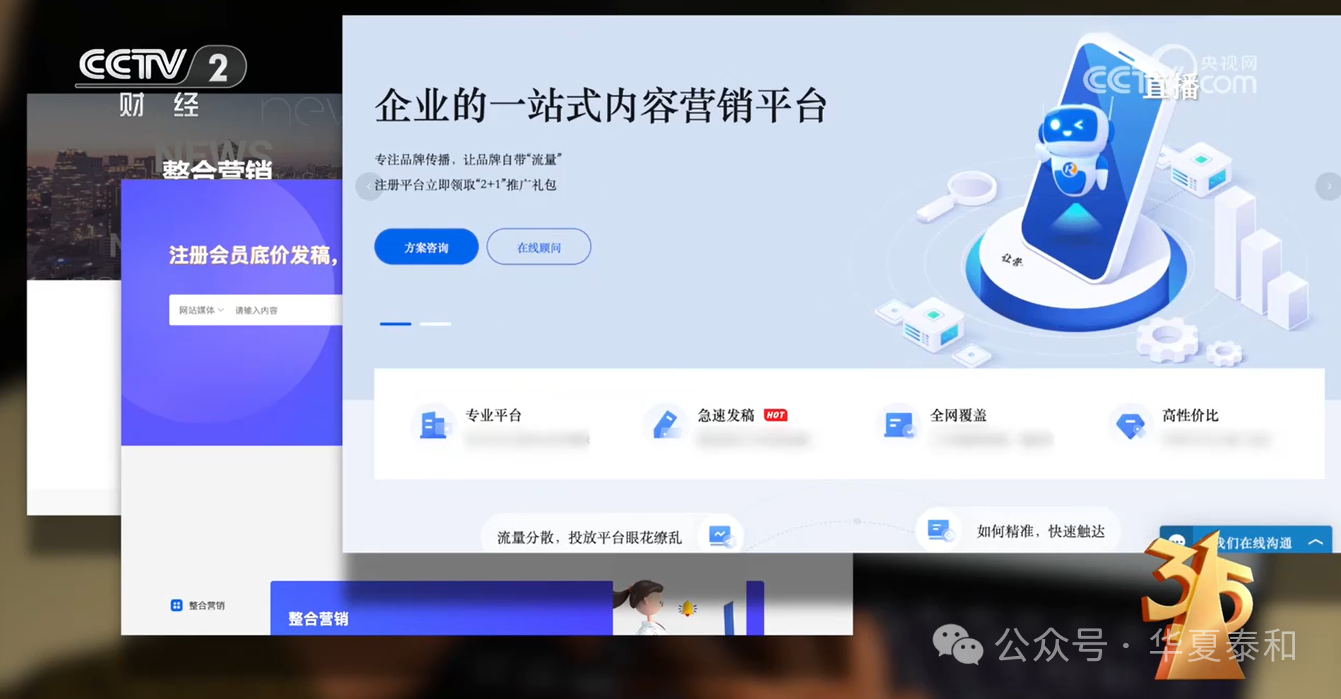 OCR:IMG:ccV 2 cCT直播com 央视网 财经 企业的一站式内容营销平台 整合营销 专注品牌传播,让品牌自带“流量 注册平台立即领取“2+1推广礼包 注册会员底价发稿 方案咨询 在线顾间 让宗 网站媒体 请输入内言 专业平台 急速发稿 HOT 全网覆盖 高性价比 流量分散,投放平台眼花缴乱 如何精准,快速触达 55 我们在线沟通 整合营销 整合营销 公众号·华夏泰和