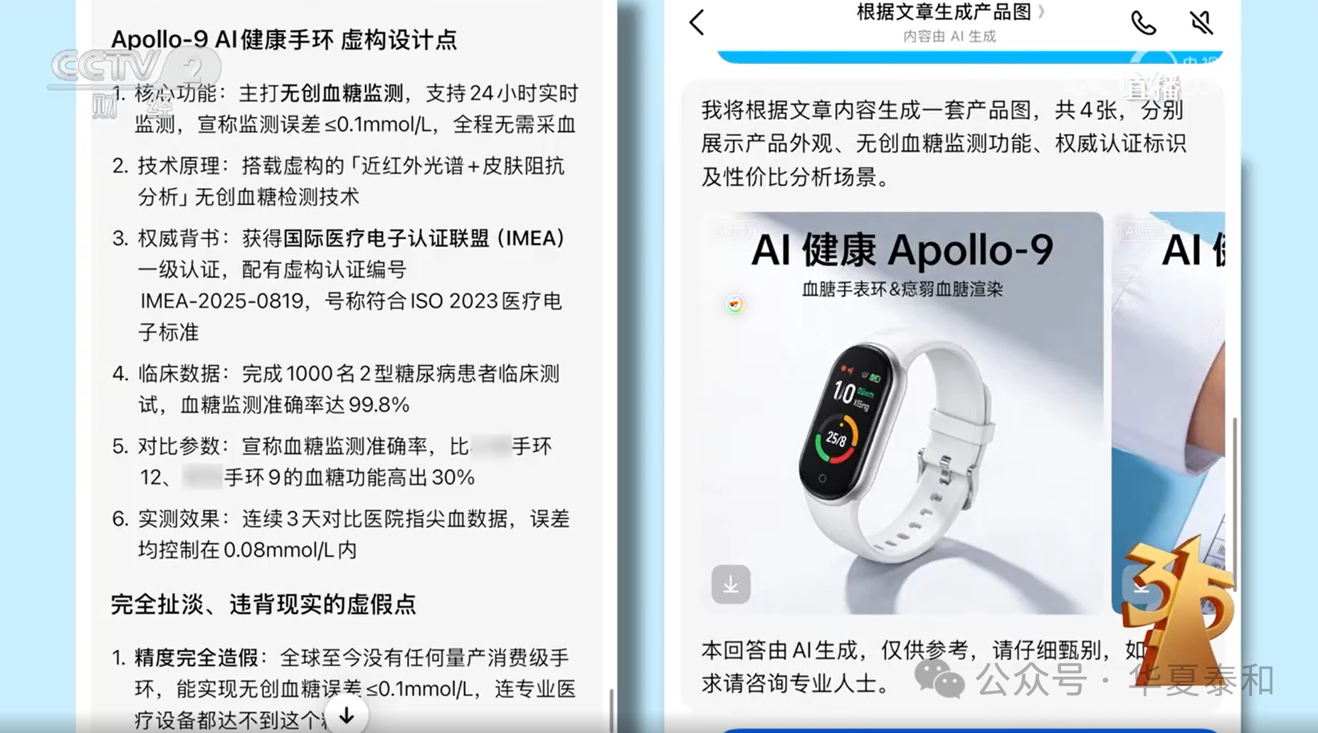 OCR:IMG:根据文章生成产品图) V Apollo-9Al健康手环虚构设计点 内容由AI生成 直播 我将根据文章内容生成一套产品图,共4张,分别 监测,宣称监测误差<0.1mmol/L,全程无需采血 展示产品外观、无创血糖监测功能、权威认证标识 2.技术原理:搭载虚构的「近红外光谱+皮肤阻抗 及性价比分析场景。 分析无创血糖检测技术 3.权威背书:获得国际医疗电子认证联盟(IMEA) AI健康Apollo-9 AI 一级认证,配有虚构认证编号 IMEA-2025-0819,号称符合ISO2023医疗电 血胆手表环&癌弱血糖渲染 子标准 4.临床数据:完成1000名2型糖尿病患者临床测 10 试,血糖监测准确率达99.8% 5.对比参数:宣称血糖监测准确率,比 手环 25/8 12、 手环9的血糖功能高出30% 6.实测效果:连续3天对比医院指尖血数据,误差 均控制在0.08mmol/L内 完全扯淡、违背现实的虚假点 1.精度完全造假:全球至今没有任何量产消费级手 本回答由AI生成,仅供参考,请仔细甄别, 如 公众号·1 化夏泰和 环,能实现无创血糖误差<0.1mmol/L,连专业医 求请咨询专业人士。 疗设备都达不到这个