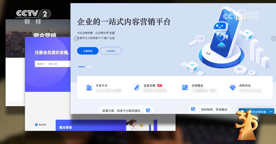 OCR:IMG:CCTV cCT直播com 央视网 财经 企业的一站式内容营销平台 整 专注品牌传播,让品牌自带“流量” 注册平台立即领取“2+1推广礼包 注册会员底价发稿 方案咨询 在线顾问 众 阿站媒体 请维入内容 日 专业平台 急速发稿 NOT 全网覆盖 高性价比 流量分散,投放平台眼花缭乱 如何精准,快速触达 我们在线沟通 2 整合营销 整合营销