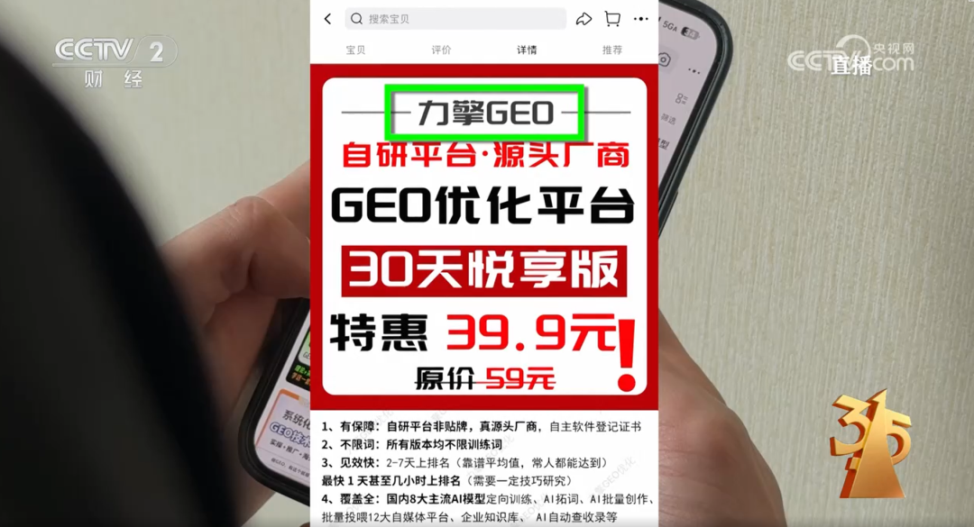 OCR:IMG:Q 搜索宝贝 2 5GA30 CCTV 2 宝贝 评价 详情 推荐 cCT直播com 央视网 o 财 经 力擎GEO 82 福选 自研平台·源头厂 商 GEO优化平台 30天悦享版 特惠 39.9元 原价 59元 系统化 GEO技水 1、有保障:自研平台非贴牌,真源头厂商,自主软件登记证书 2、不限词:所有版本均不限训练词 3、见效快:2-7天上排名(靠谱平均值,常人都能达到) 最快1天甚至几小时上排名(需要一定技巧研究) 公众号·华夏泰和 4、覆盖全:国内8大主流AI模型定向训练、A1拓词、AI批量创作、 批量投喂12大自媒体平台、企业知识库、A1自动查收录等