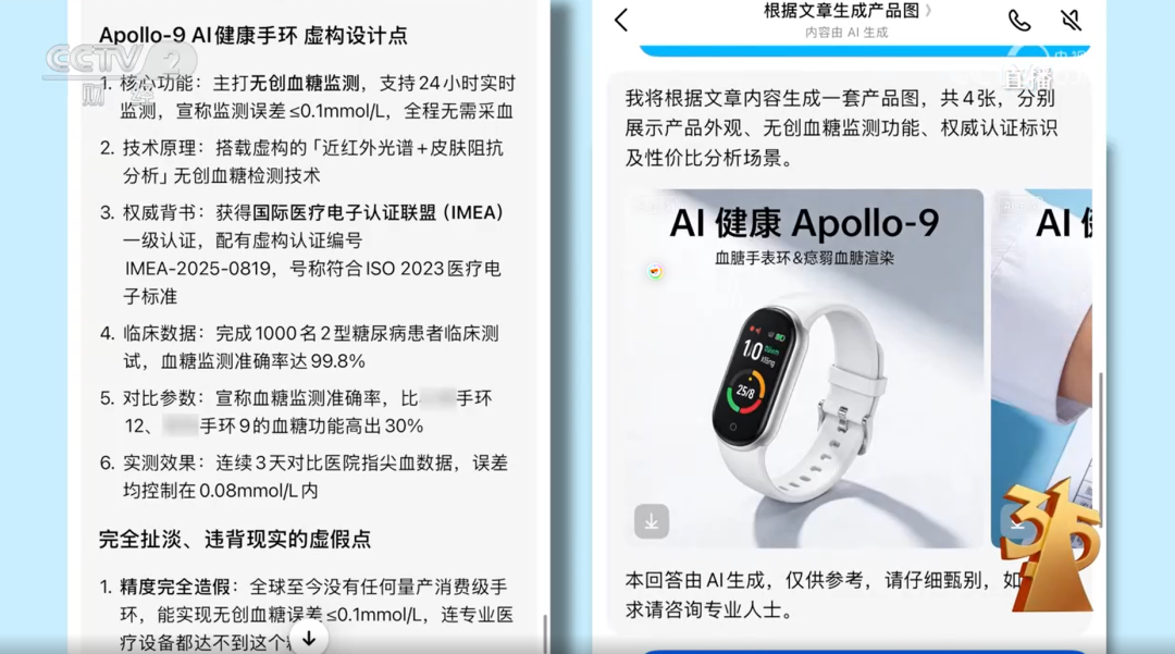 OCR:IMG:根据文章生成产品图) S Apollo-9Al健康手环虚构设计点 内容由AI生成 直播 我将根据文章内容生成一套产品图,共4张,分别 监测,宣称监测误差s0.1mmol/L,全程无需采血 展示产品外观、无创血糖监测功能、权威认证标识 2.技术原理:搭载虚构的近红外光谱+皮肤阻抗 及性价比分析场景。 分析无创血糖检测技术 3.权威背书:获得国际医疗电子认证联盟(IMEA) AI健康Apollo-9 AI 一级认证,配有虚构认证编号 IMEA-2025-0819,号称符合1SO2023医疗电 血糖手表环&癌血糖渲染 子标准 4.临床数据:完成1000名2型糖尿病患者临床测 试,血糖监测准确率达99.8% 10 5.对比参数:宣称血糖监测准确率,比 12、 手环9的血糖功能高出30% 6.实测效果:连续3天对比医院指尖血数据,误差 均控制在0.08mmol/L内 完全扯淡、违背现实的虚假点 1.精度完全造假:全球至今没有任何量产消费级手 本回答由AI生成,仅供参考,请仔细甄别, 如 环,能实现无创血糖误差s0.1mmol/L,连专业医 求请咨询专业人士。 疗设备都达不到这个