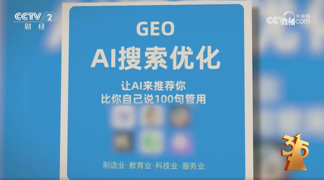 OCR:IMG:CCTV2 cC值播com 央视网 财经 GEO AI搜索优化 让AI来推荐你 比你自己说100句管用 制造业·教育业·科技业·服务业