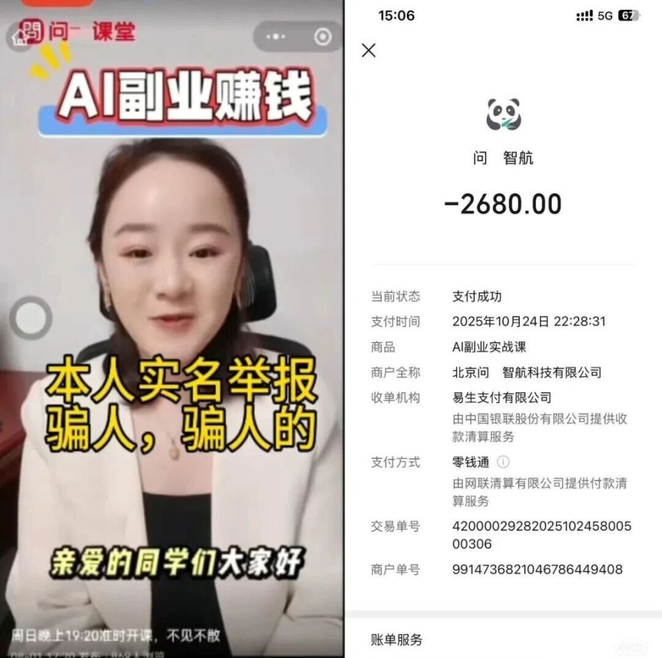 OCR:IMG:閣问-课堂 15:06 !!5G67 电 × AI副业赚钱 问智航 -2680.00 当前状态 支付成功 支付时间 2025年10月24日22:28:31 商品 AI副业实战课 本人实名举报 商户全称 北京问 智航科技有限公司 收单机构 易生支付有限公司 骗人,骗人的 由中国银联股份有限公司提供收 款清算服务 支付方式 零钱通① 由网联清算有限公司提供付款清 算服务 交易单号 42000029282025102458005 亲爱的同学们大家好 00306 商户单号 9914736821046786449408 周日晚上19:20准时开课, 不见不散 账单服务